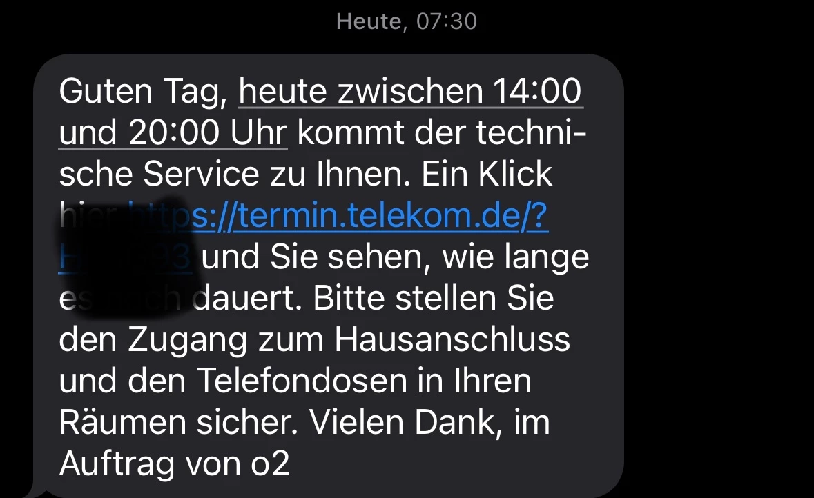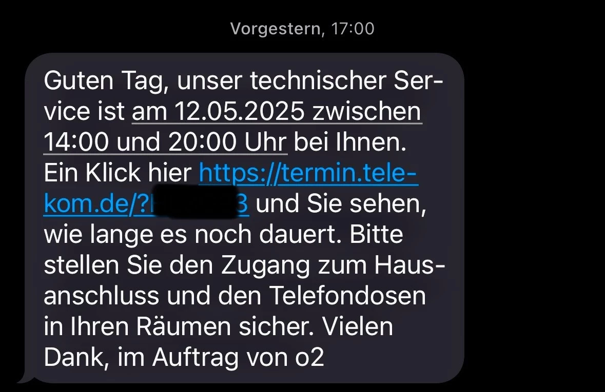 “Guten Tag, bitte rufen Sie uns von vor Ort vom Handy an unter 0800/52xxxxx, damit wir weitere Prüfungen vornehmen können. Ticket 97xxxxx - Ihr O2 Team”