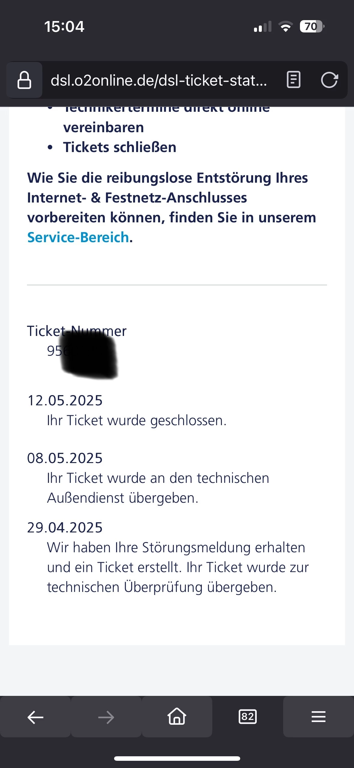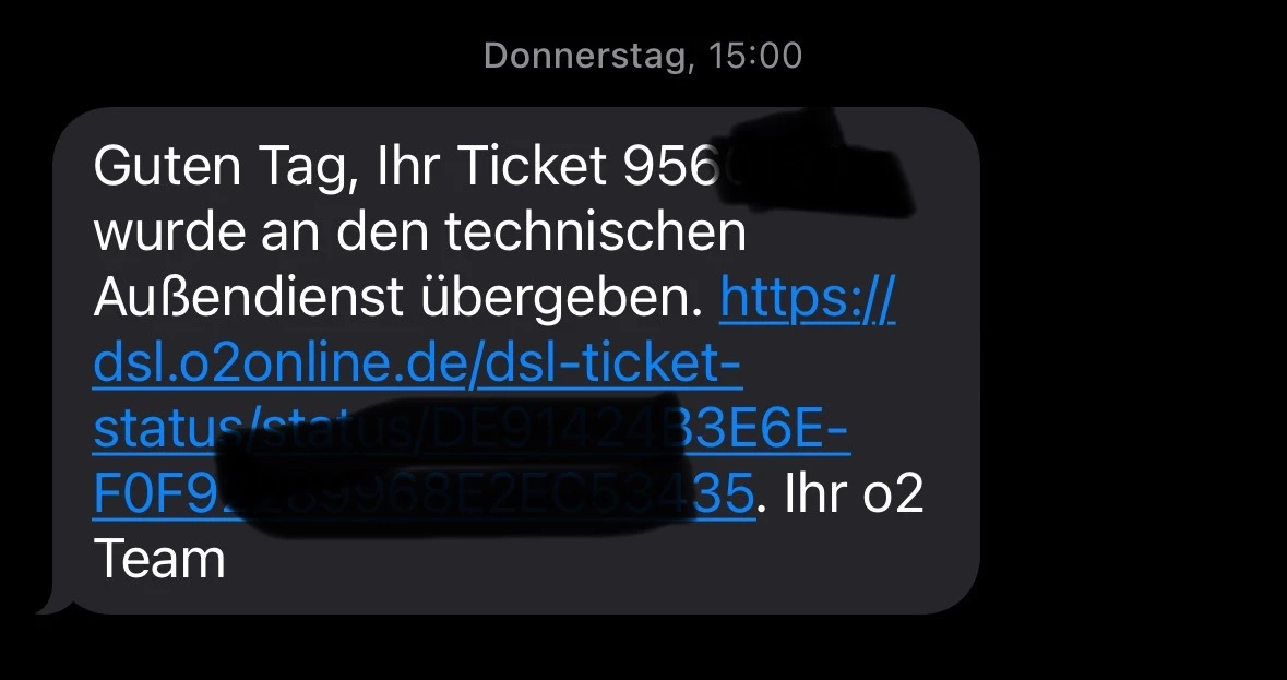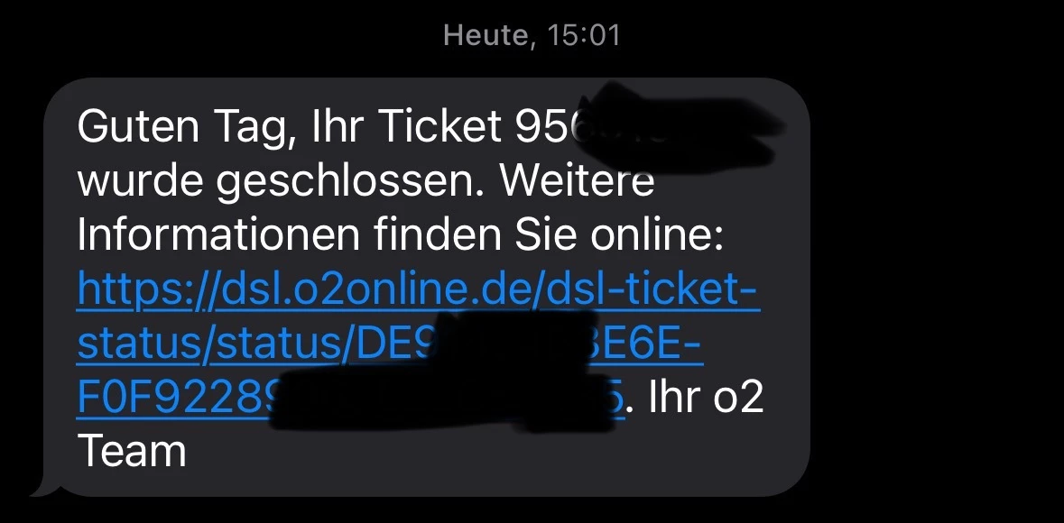 “Guten Tag, bitte denken Sie daran, dass wir zum Ticket 95xxxxx Ihre Rückmeldung benötigen, um die Entstörung fortzusetzen. Ihr o2 Team”