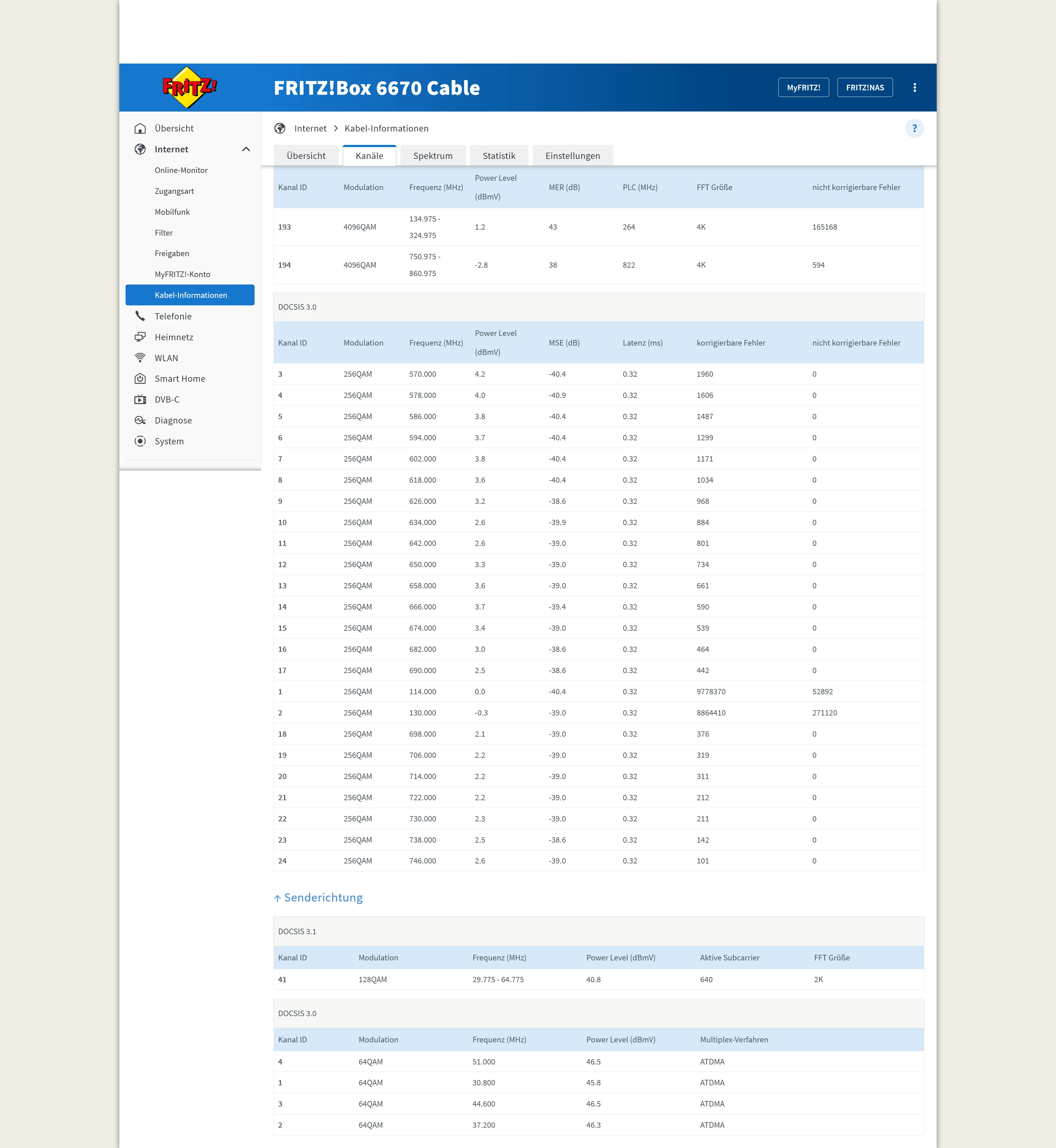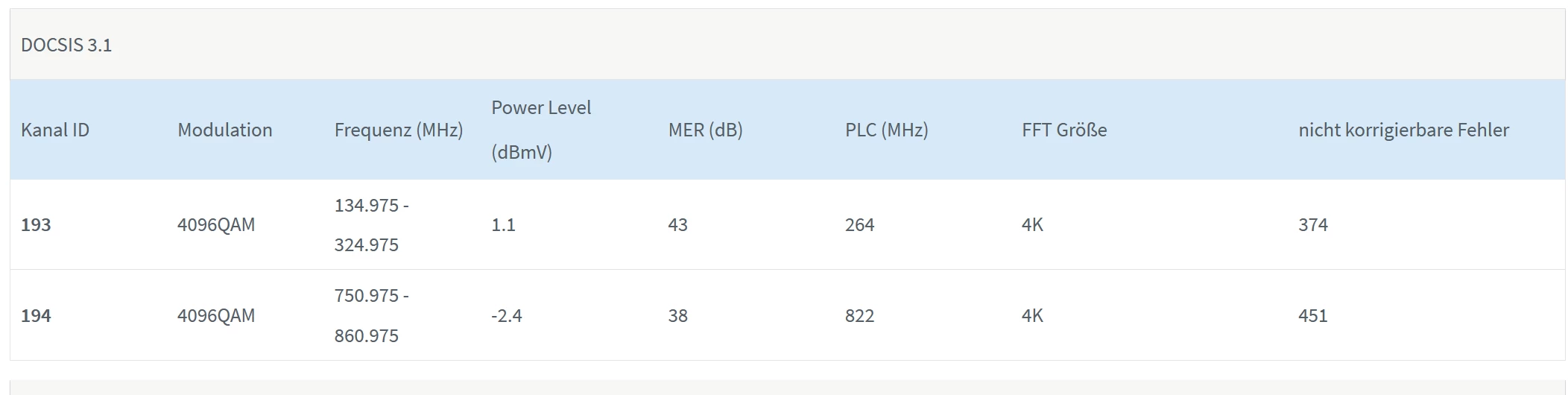 Dass Soll in Empfangsrichtung ist 4096QAM, für Docsis 3.1 (D3.1) und 256QAM für Docsis 3.0 (D3.0)).