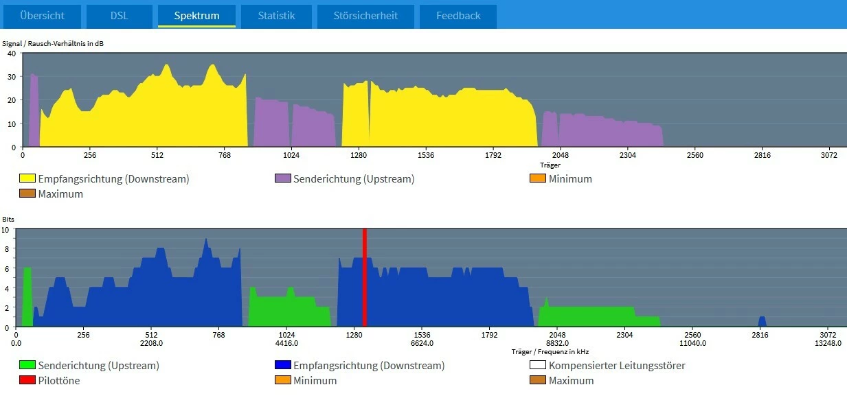 Die geschätzte Leitungslänge hat sich laut Fritzbox um ca, 90-100 Meter verlängert, die Leitungskapazität um ca. 20 MBit im Down- und 5 MBit im Upload reduziert. Ich beobachte deutlich mehr Fehler im Protokoll und das Spektrum sieht sehr merkwürdig aus: