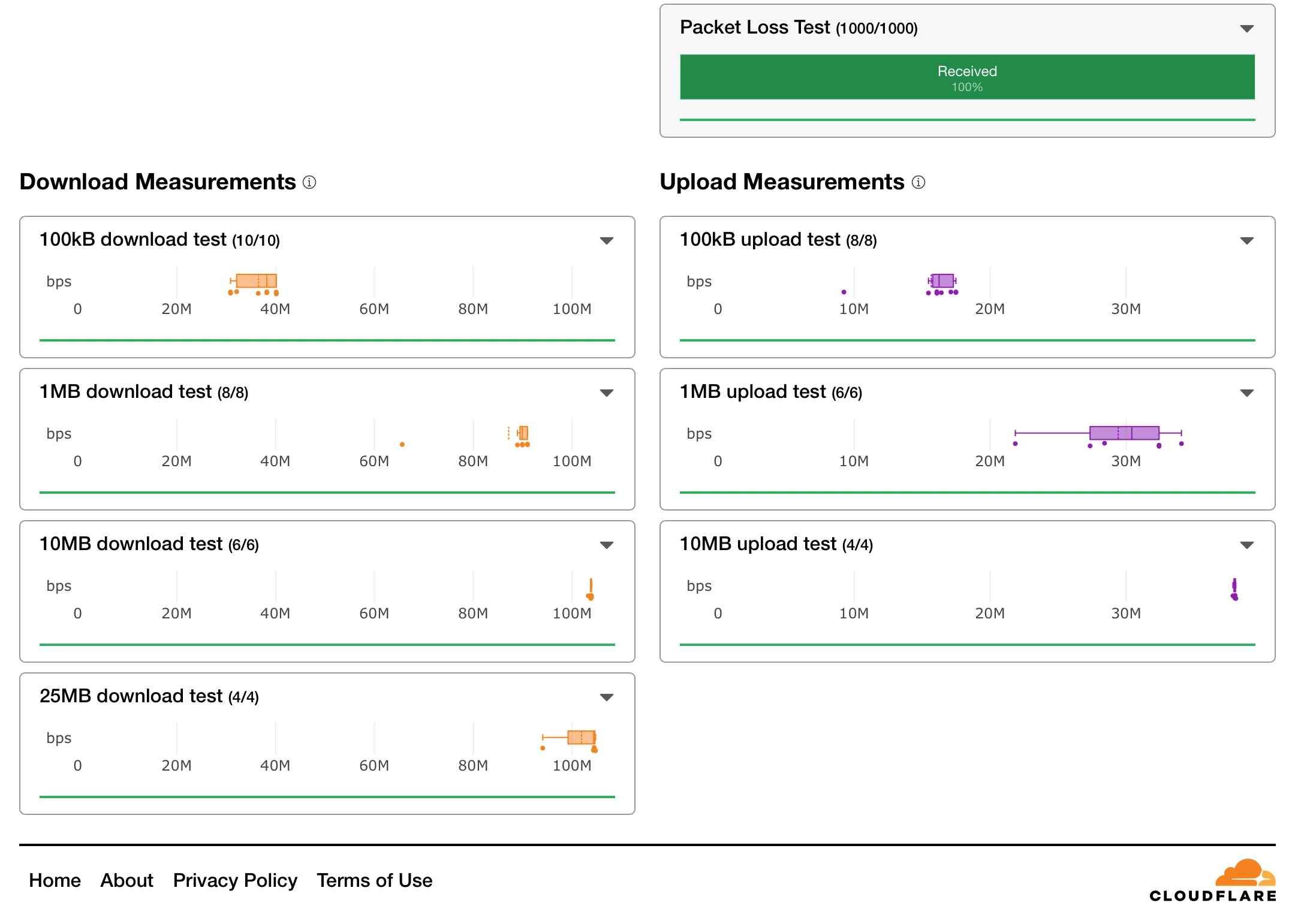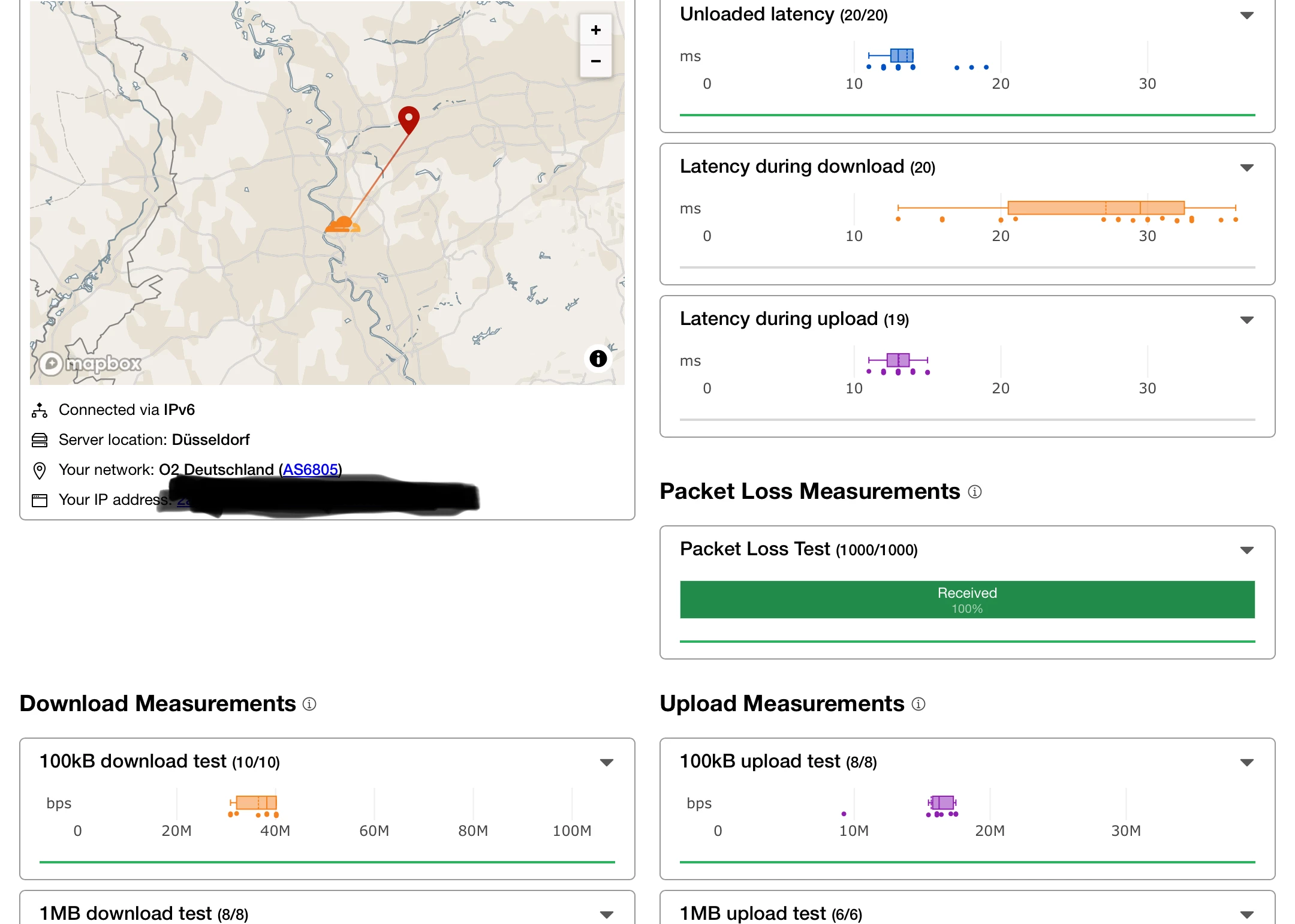 und zusaetzlich koenntest Du bitte einen "Speedtest"*  bei Cloudflare machen und eine Screenshot der gesamten Resultatsseite posten? (Da ist auch ein Losstest dabei)