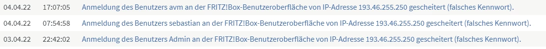 Anmeldung des Benutzers Admin an der FRITZ!Box-Benutzeroberfläche von IP-Adresse 193.46.255.250 gescheitert (falsches Kennwort). [2 Meldungen seit 04.04.22 01:12:43]