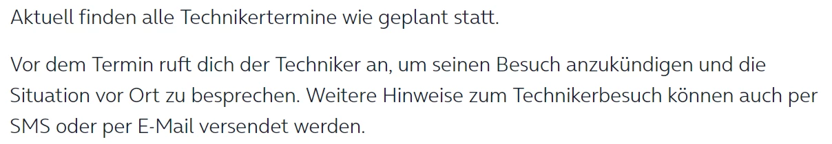 Wurde dir in deiner Auftragsbestätigung ein Technikertermin vor Ort angekündigt, musst du während dieses Zeitfensters anwesend sein.