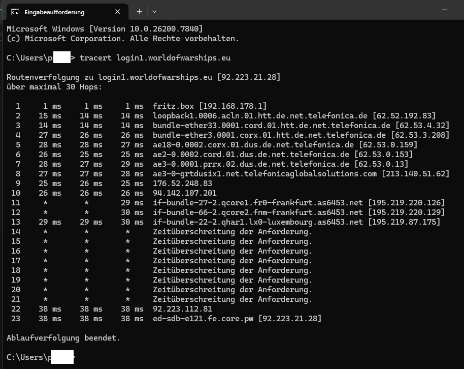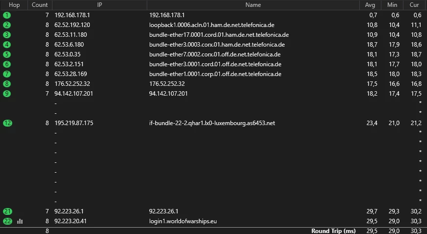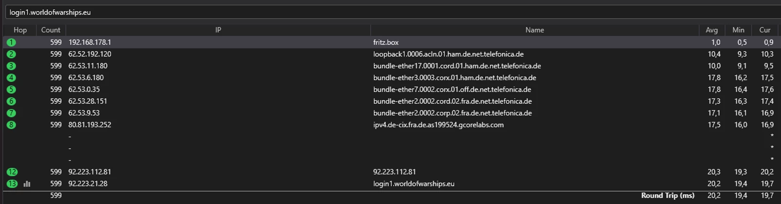 Da ich in Traceroutes "meine Richtung zu den Servern" sehen kann, gehe ich davon aus, dass o2 hier etwas umgestellt hat, und das Problem dadurch eher auf der Seite von o2 liegt, als bei Wargaming.