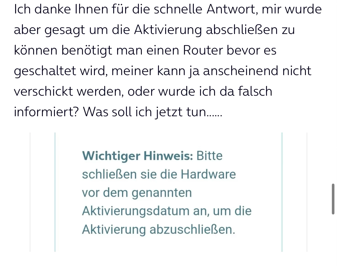 Der Kabelanschluss ist bereits aktiviert und könnte theoretisch schon mit einem eigenen Router genutzt werden, falls das für dich eine Option ist. Bitte gib uns oder der Kundenbetreuung in diesem Fall noch einmal Bescheid, da wir dann den Versand noch stoppen müssten.