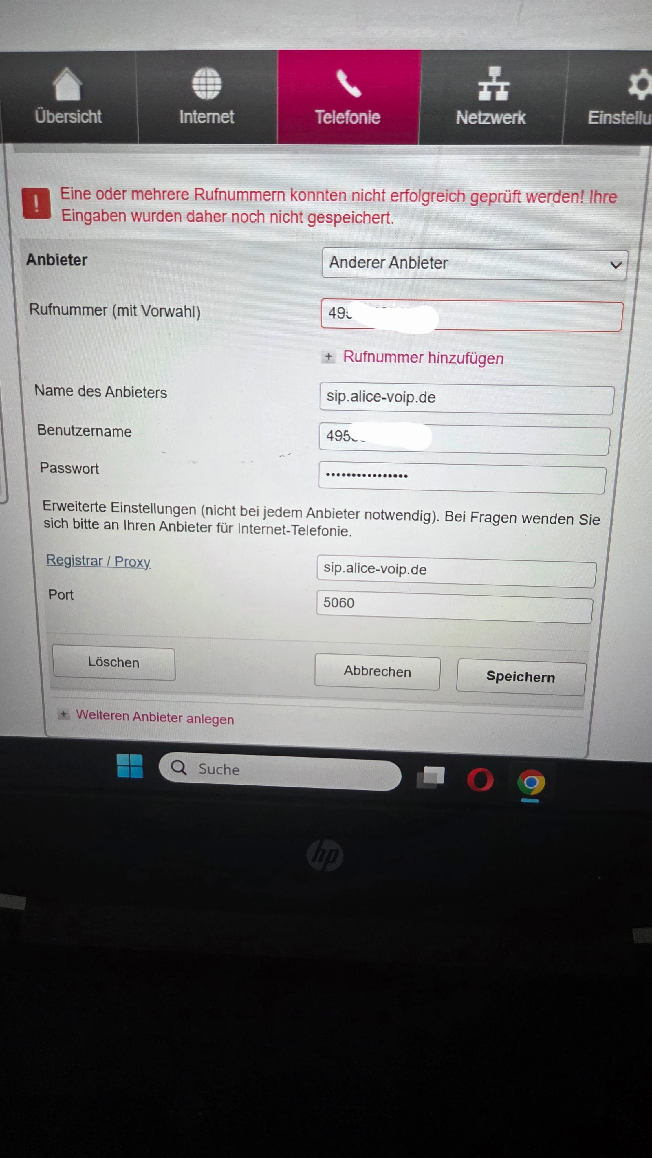Wenn ich alle Daten im Speedport eingebe und speichern will, ist das Feld mit Rufnummer (mit Vorwahl) rot umrandet und es kommt die Fehlermeldung: