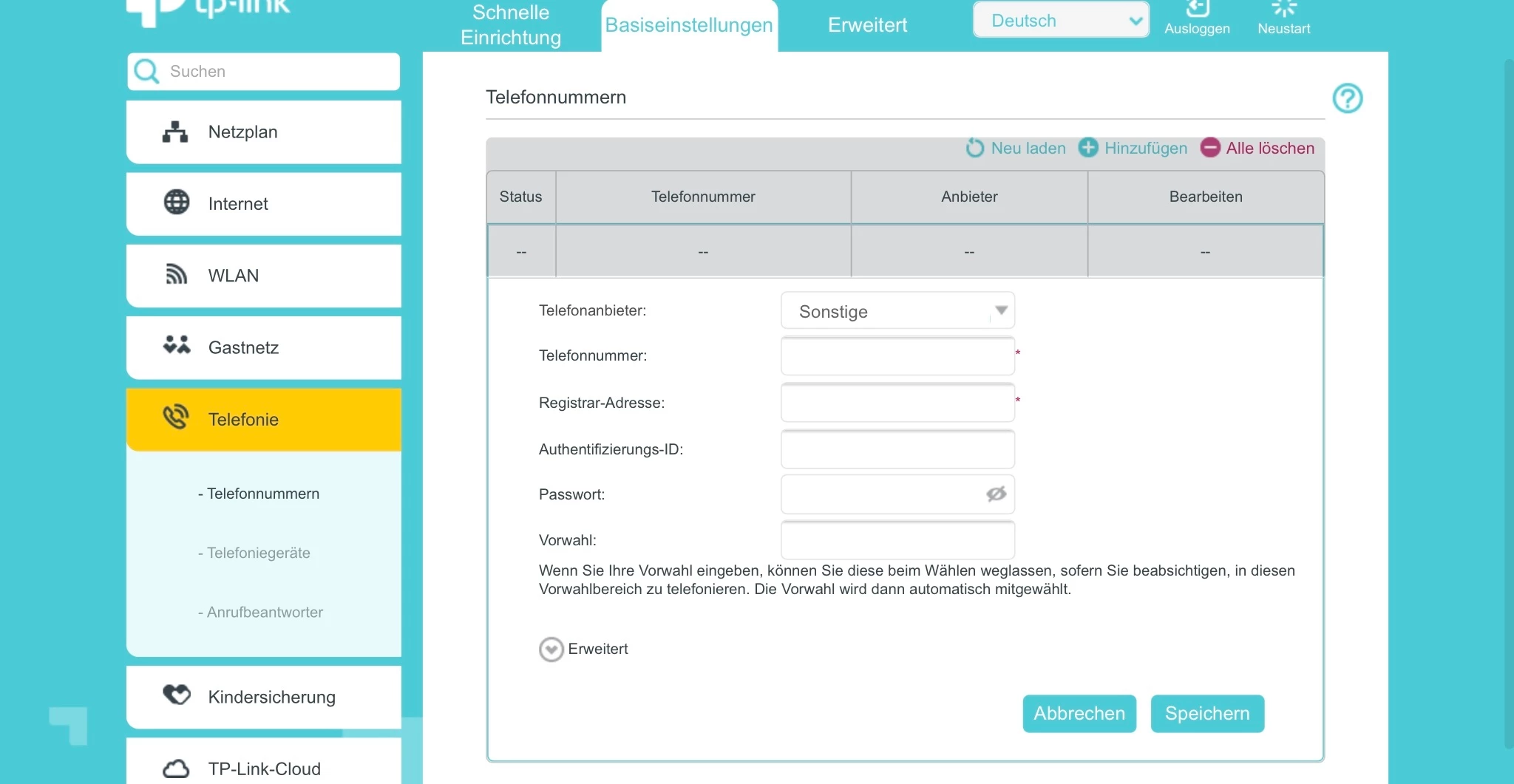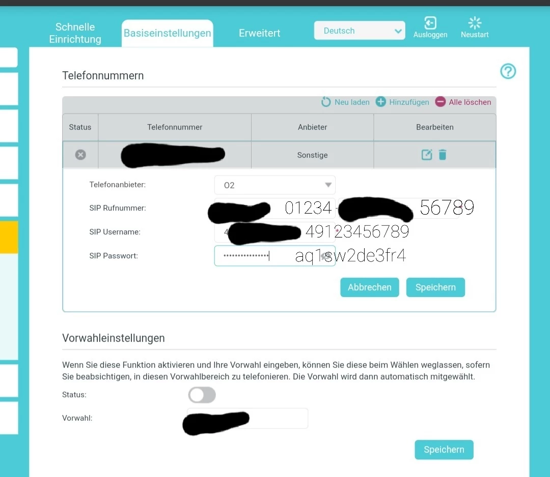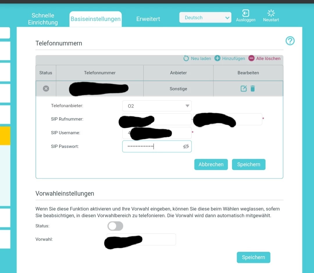 Wie schon im ersten Post erwähnt. Die richtigen Daten für die Telefonie im O2 Telefonie Profil des Routers eingetragen ohne Null mit Null mit 49 davor usw... also die üblichen verdächtigen sind alle durch… und es gibt kein Erweiterte Einstellungen bei einem O2 Profil.