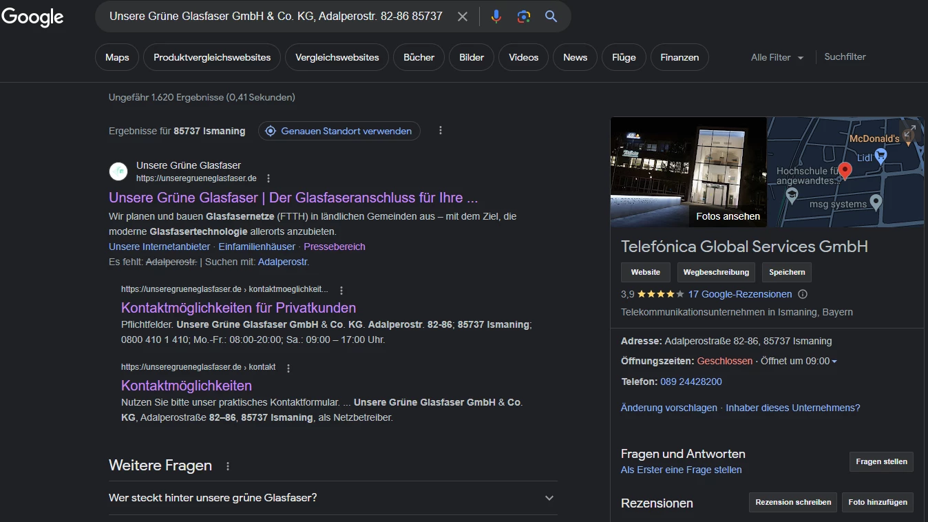 jetzt macht die Anzeige mit “Dauerhaft geschlossen” bei Google sinn. Sucht man nach “Unsere Grüne Glasfaser GmbH & Co. KG, Adalperostr. 82-86 85737 Ismaning” bekommt man keinen Google Maps Eintrag mehr und somit auch keine Resonanzen. Es gibt unter der Adresse nur nur die “Telefónica Global Services GmbH”