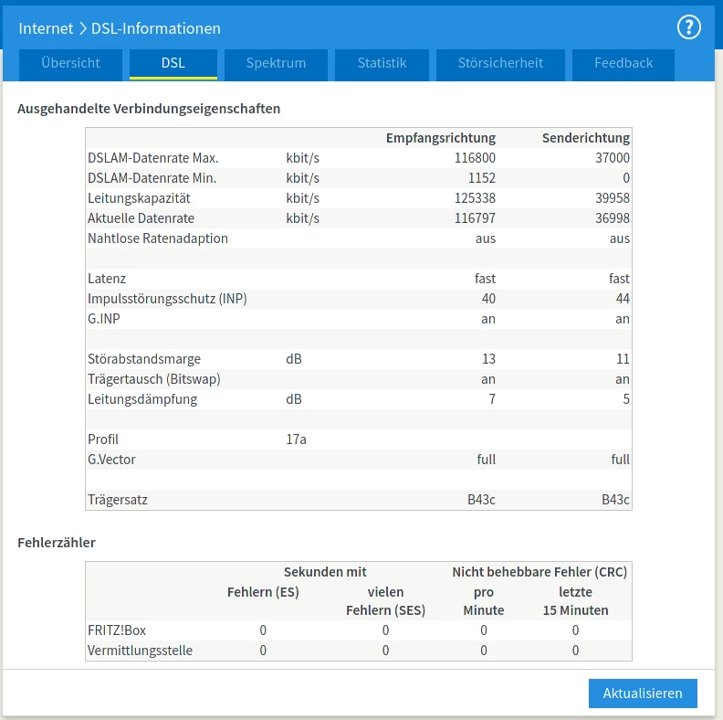 Das Modem der FritzBox 7412 synchronisiert inzwischen mit ↓ 116,8 Mbit/s↑ 43,5 Mbit/s. DSL läuft sogar etwas schneller als erwartet mit  gut 57 Mbit/s - Up und um die 11,7 Mbit/s Down.