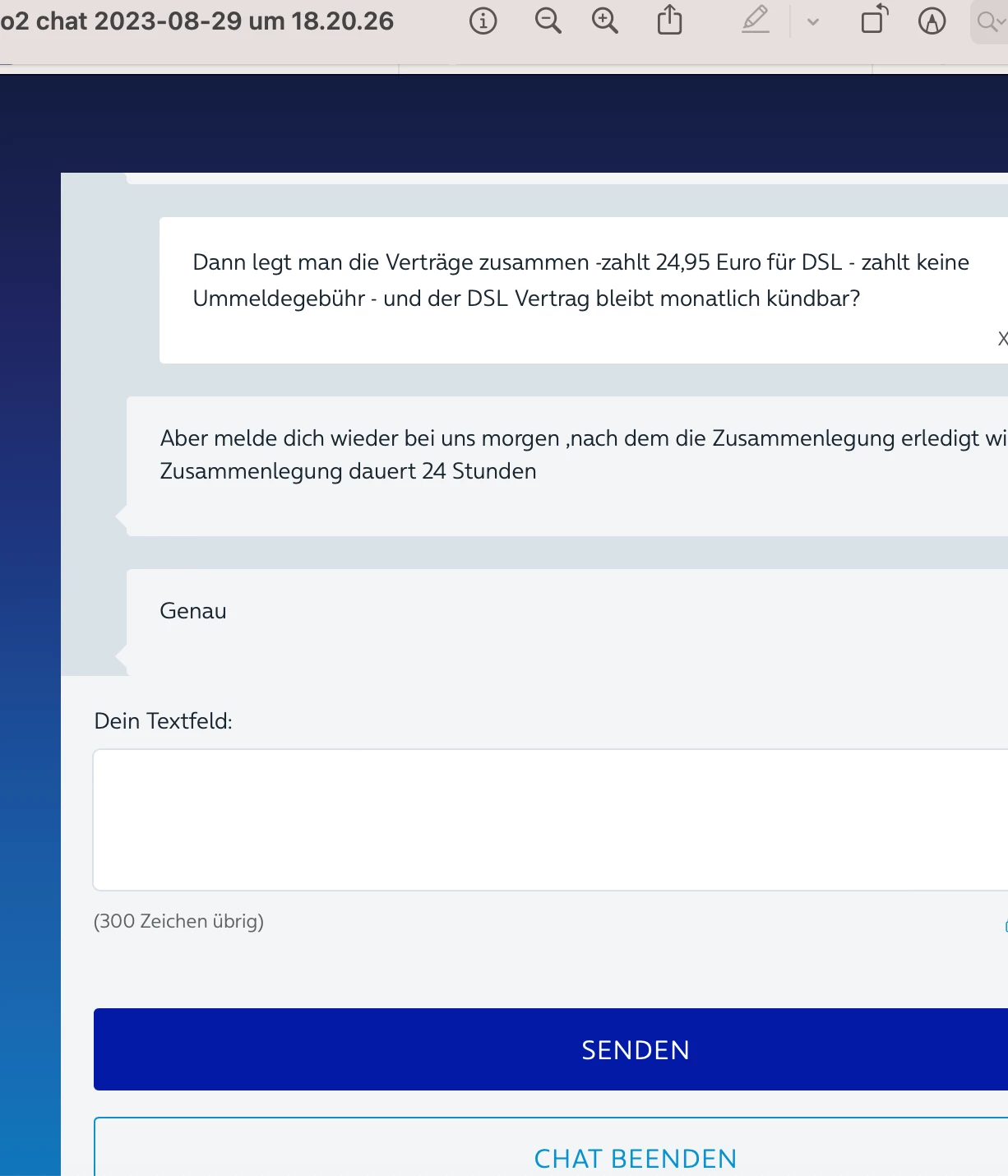 2.Wie nachweislich im Chat vereinbart (Screenshots vorhanden) den bisherigen DSL Vertrag für 24,95 Euro mtl. kündbar (wie aktuell), ohne Anmelde-/Wechsel-/ oder jegliche weitere Gebühren.