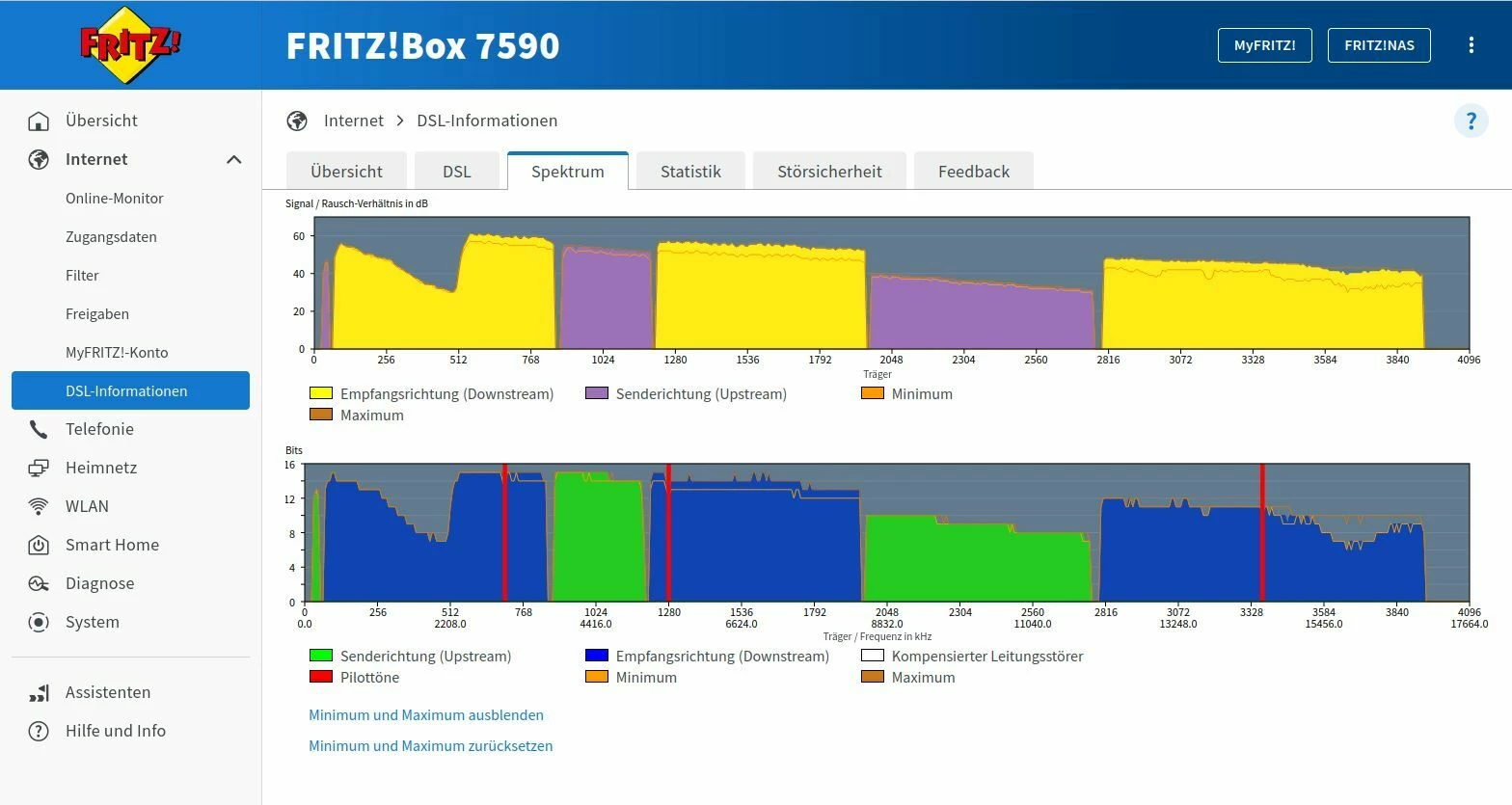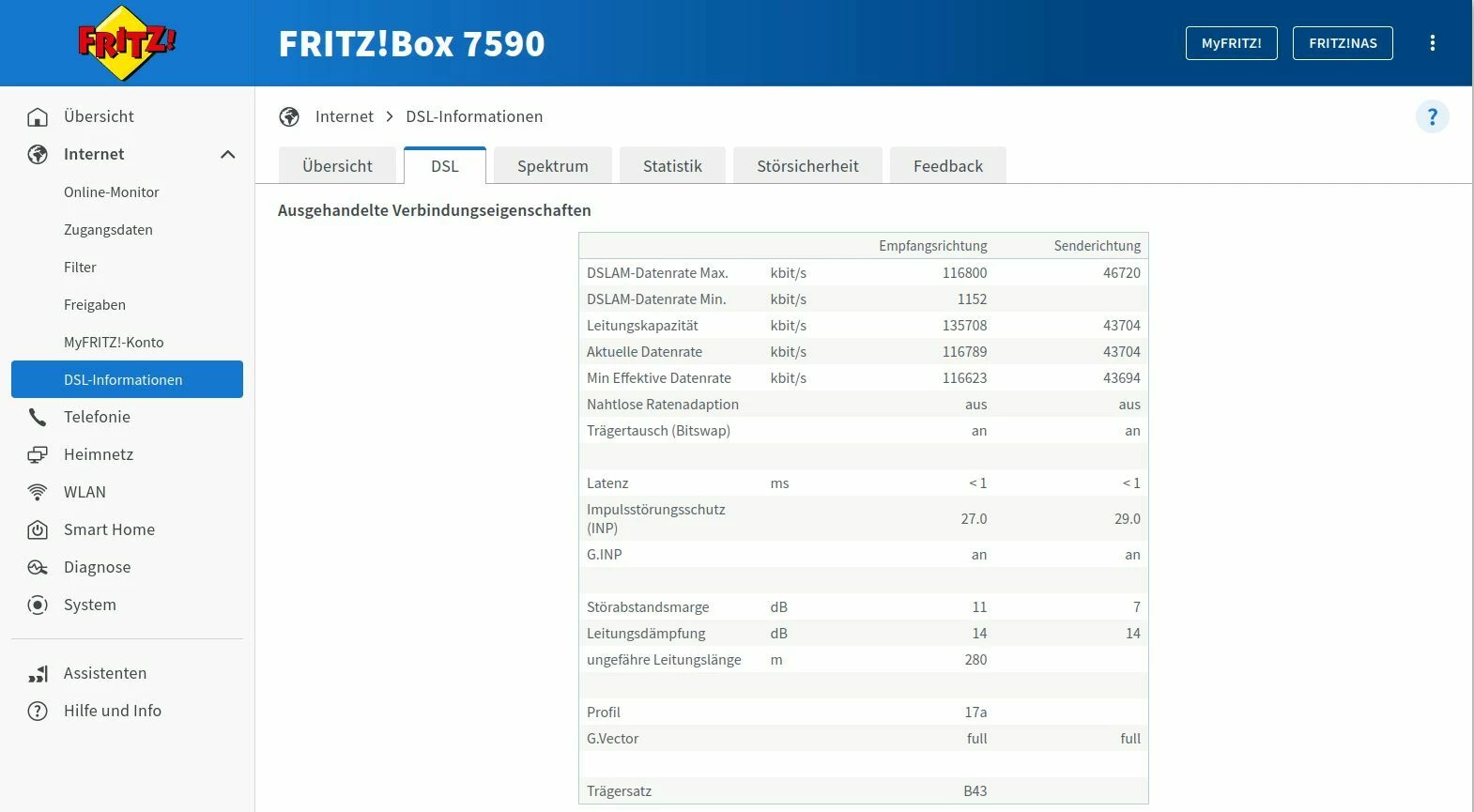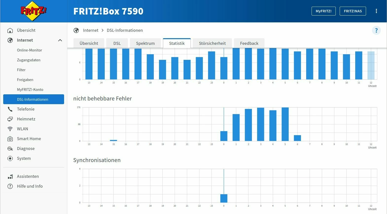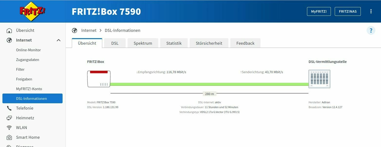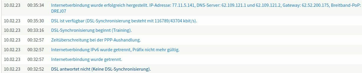 ich habe seit einigen Wochen mehrmals Unterbrechungen der DSL-Verbindung ( DSL antwortet nicht ). Die Häufigkeit liegt zwischen mehrmals die Woche bis täglich. Vor 4 Tagen habe ich dann meine FB7590 völlig neu ( ohne Einspielen einer Sicherung ) eingerichtet. Hat aber nichts gebracht. Die Unterbrechungen dauern immer um die 3 Minuten und sind unabhängig von der Tageszeit. Ich habe nur eine Telefonbuchse, welche vor 2 Jahren mal von einem Techniker erneuert wurde. An der Verkabelung hat sich nichts geändert, alle Kabel liegen frei und ungeknickt. Anbei einige Screenshots aus der Fritzbox. Was kann man tun, es nervt halt. Bin schon am überlegen, zum Kabelbetreiber zu wechseln, was ich aber eigentlich verhindern will.