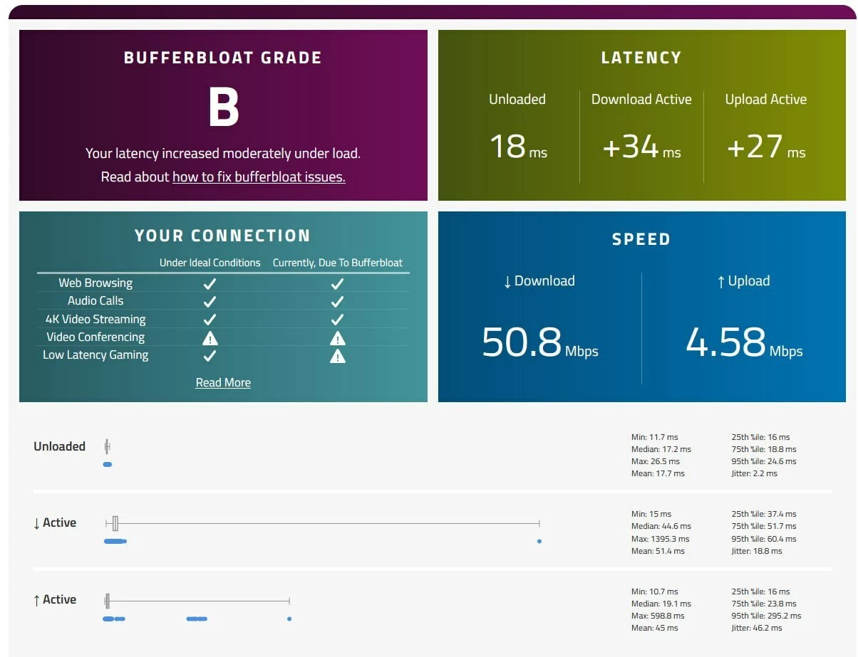 ​Problem: Besonders beim Gaming (z.B. Minecraft Legends im Koop) kommt es zu massiven Lags und Rucklern. Ein Test auf Bufferbloat zeigt eine Bewertung von "B" mit deutlichem Anstieg der Latenz (+27ms) im Download/Upload-Bereich.