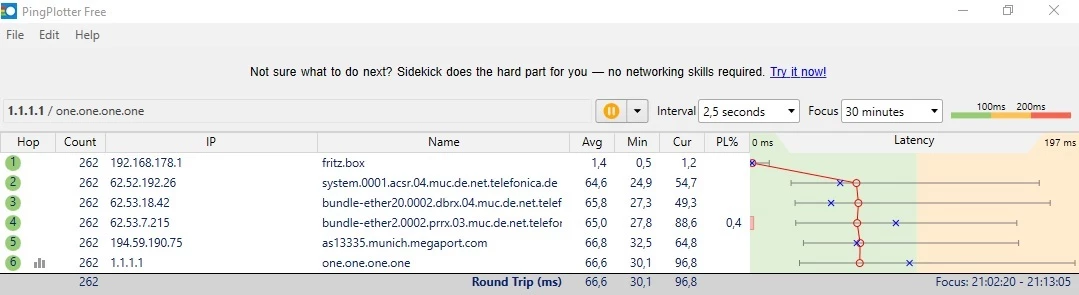 Danke für den Speedtest und den angehängenen PingPlotter Screenshot.