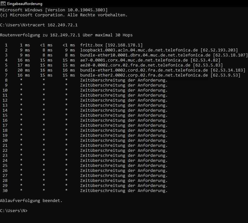 ‘’Wenn anstelle einer RTT (Round-Trip Time) ein Sternchen (*) angezeigt wird, bedeutet dies, dass ein Paket nicht innerhalb des erwarteten Zeitrahmens zurückgegeben wurde. Möglicherweise müssen Sie sich keine Sorgen machen, wenn Sie nur ein oder zwei Sternchen in einem Hop sehen. Wenn Sie jedoch 3, wie im obigen Beispiel, gefolgt von "Request timed out" sehen, könnte ein Netzwerkproblem vorliegen.’’