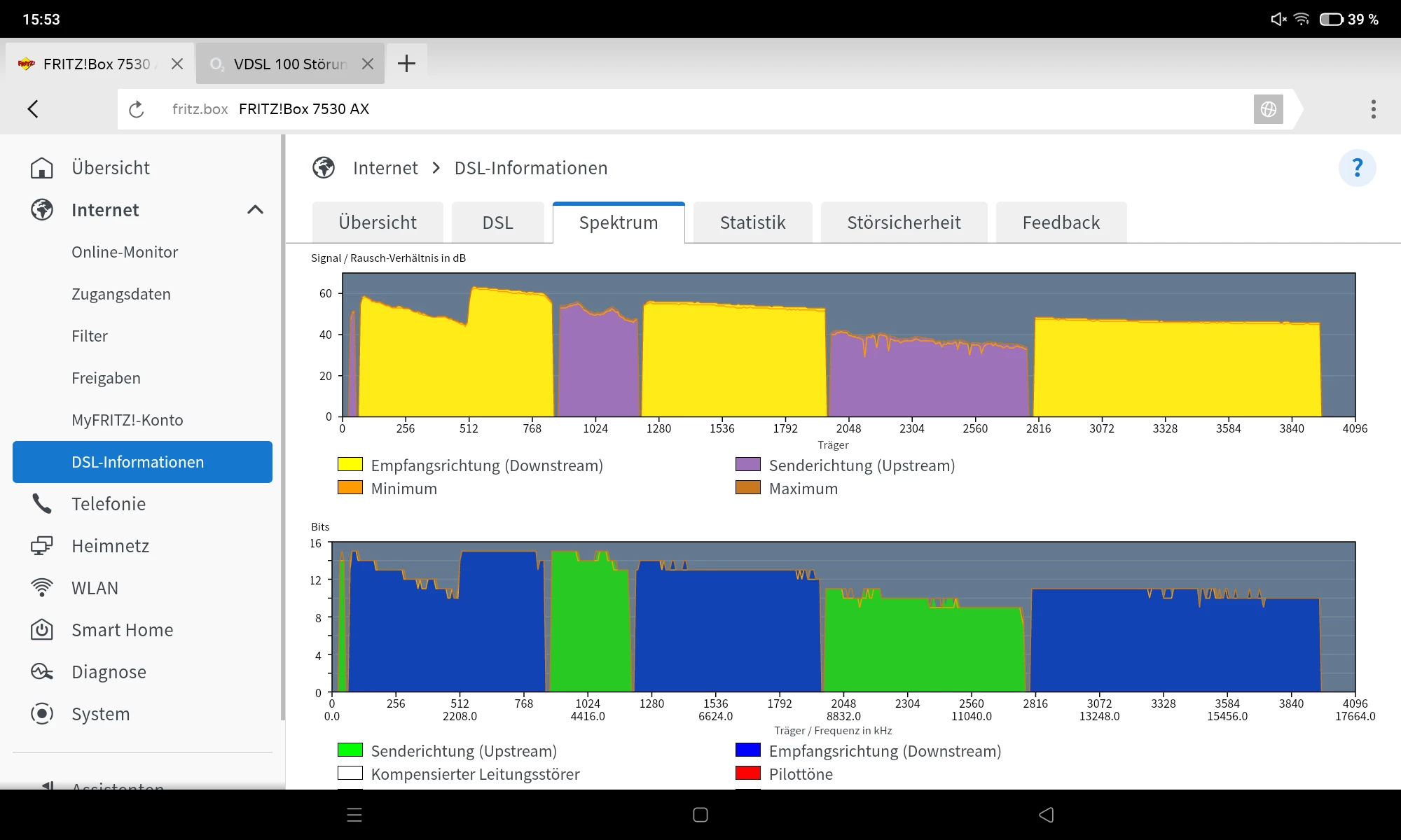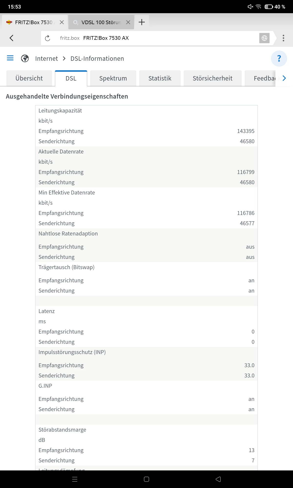 Bitte mal Übersicht, DSL, Spectrum und Statistik (Woche) als Bilder hochladen. Super wären auch Bilder von den TAE Dosen nachdem die Bilder hochgeladen wurden.