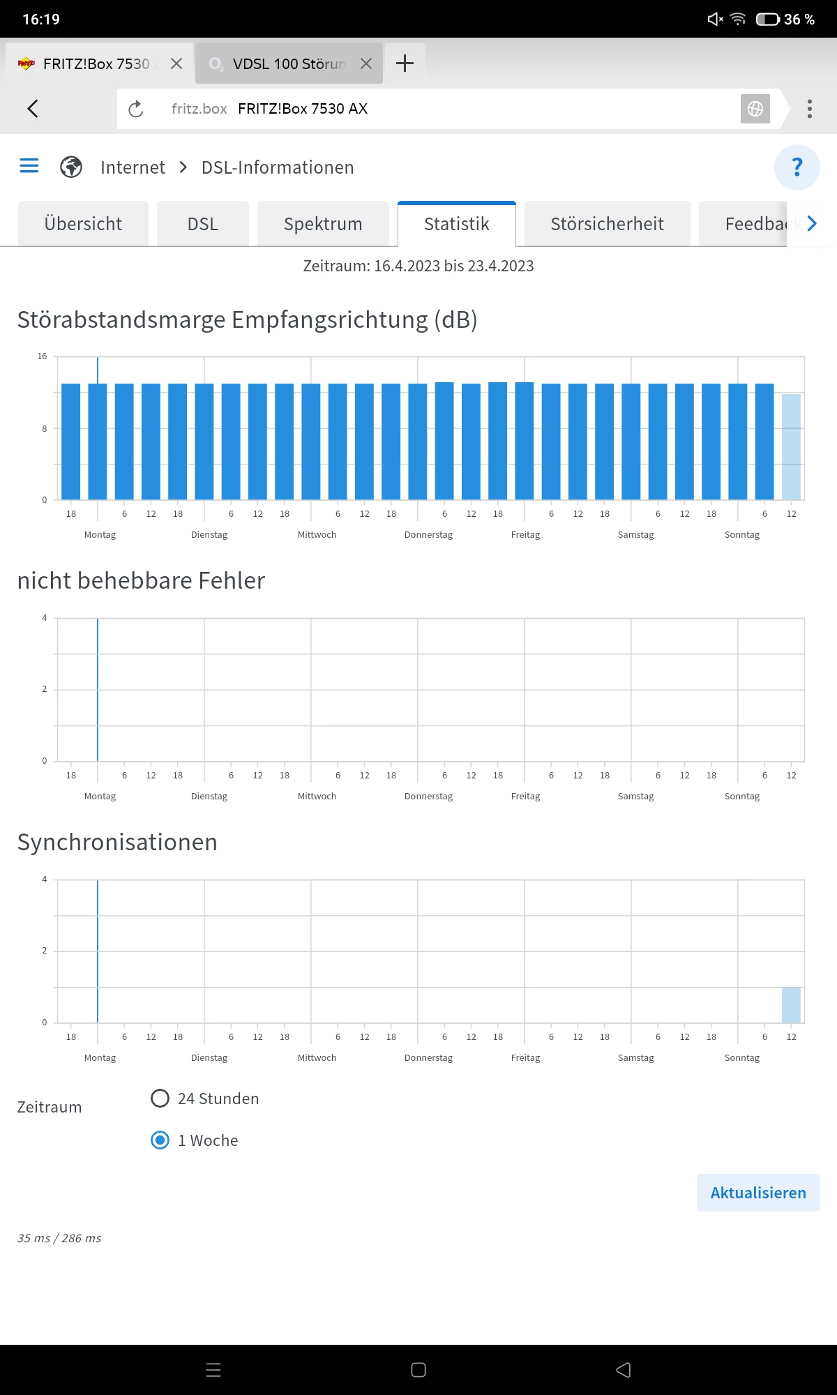 Über die ganze Woche laufen die Anschlüsse momentan stabil, Fehlerzähler sind fast immer bei null bzw im einstelligen Bereich.