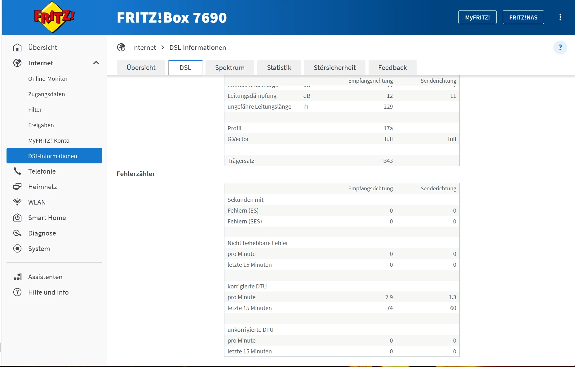 • Lösung: Prüfen Sie die Verkabelung, reinigen Sie die Telefondose, und melden Sie die hohe Zahl an korrigierten/unkorrigierten DTUs dem Internetanbieter (Telekom, O2, Vodafone etc.).