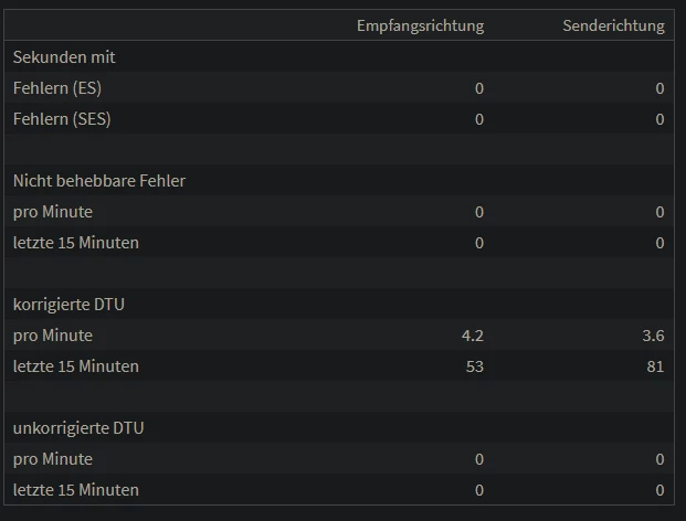 Davor war seit dem letzten Sync am 26.12.2025 bis ungefähr 05./06.01.2026 bei “korrigerte DTU” alles 0. Lediglich bei “Fehler pro Sekunde (ES) stand 1 und 1 drin (soweit ich das noch im Kopf habe.