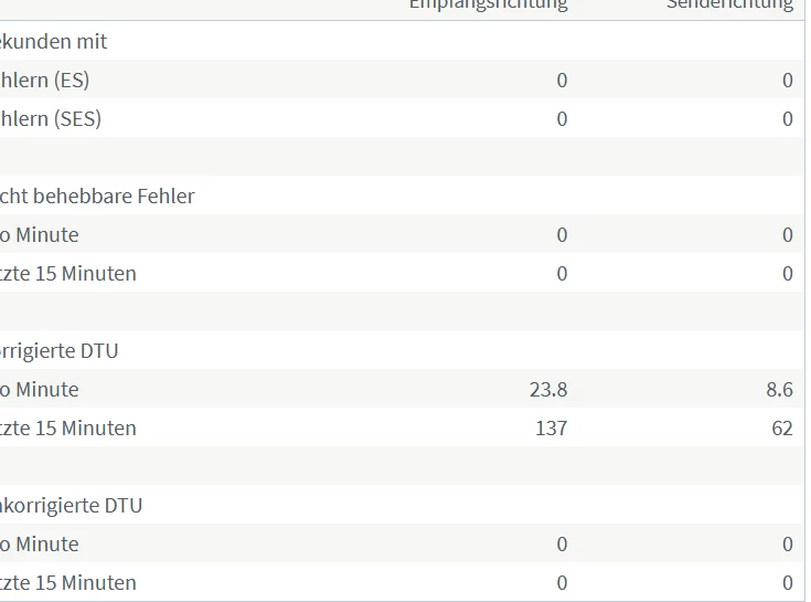 Davor war seit dem letzten Sync am 26.12.2025 bis ungefähr 05./06.01.2026 bei “korrigerte DTU” alles 0. Lediglich bei “Fehler pro Sekunde (ES) stand 1 und 1 drin (soweit ich das noch im Kopf habe.