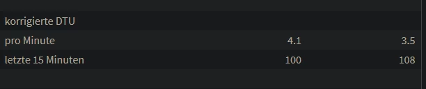 Das höchste war eben heute morgen gegen 5 Uhr mit 1056 bei  “korrigierte DTU - letzten 15 Minuten”. Bei “korrigierte DTU - pro Minute” stand was mit 2.4.