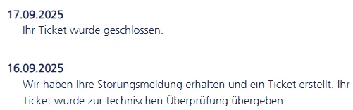 16.09.2025 > Wir haben Ihre Störungsmeldung erhalten und ein Ticket erstellt. Ihr Ticket wurde zur technischen Überprüfung übergeben.