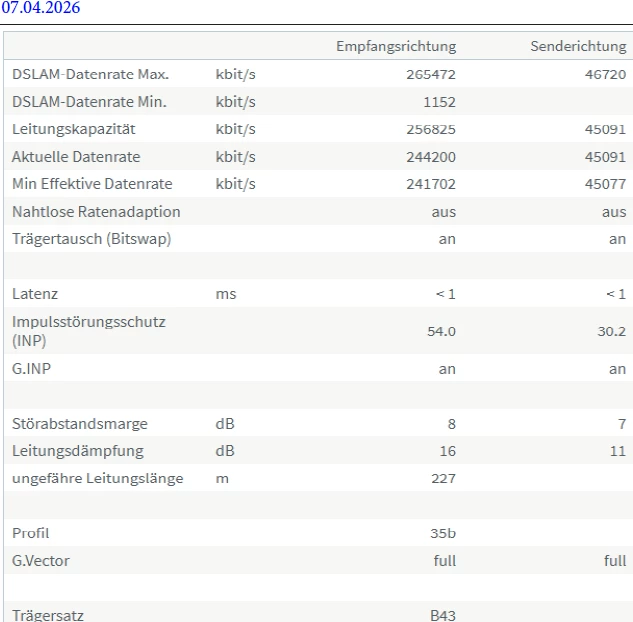 heute morgen wurde die Verbindung neu synchronisiert, ziemlich aggressiv, mal schauen wie lange der Sync durchhalten wird bis die ASSIA wieder eingreift.