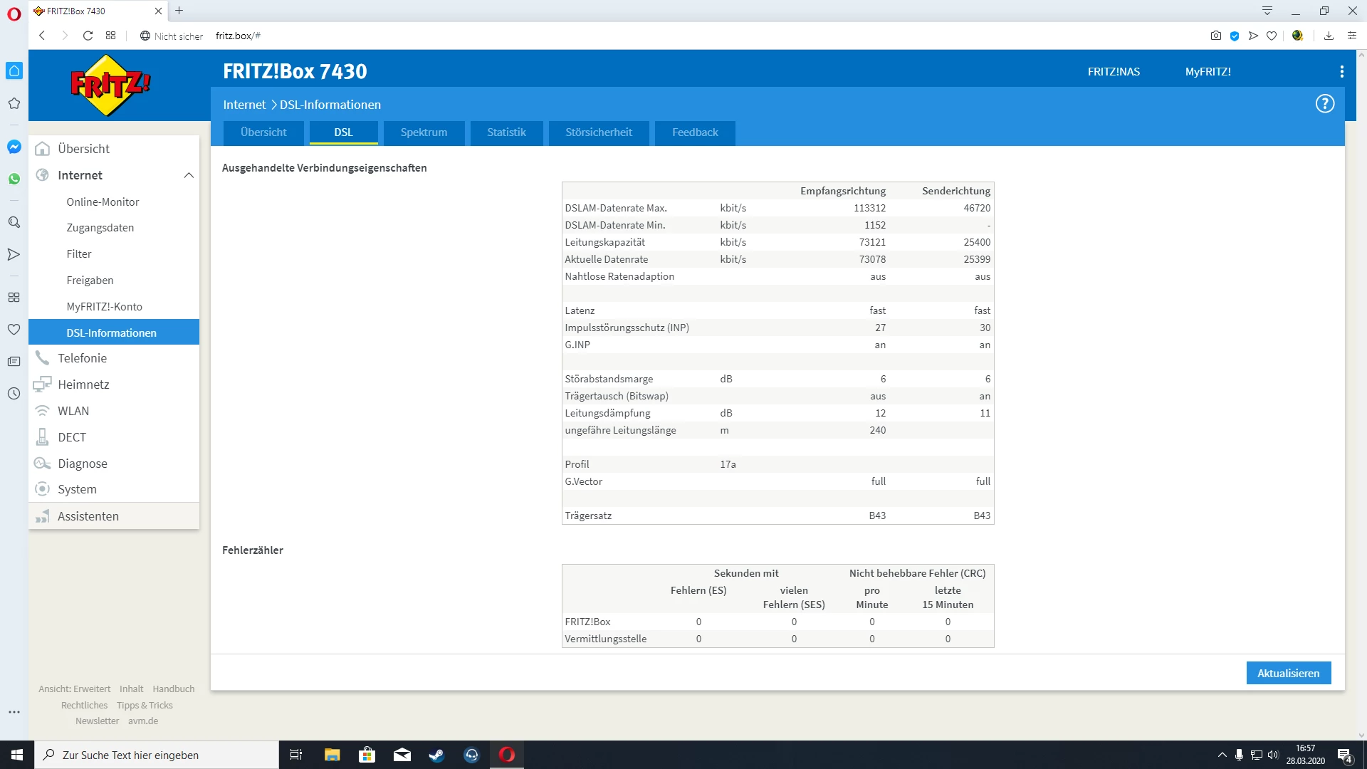 Gehe bitte in den Störeinstellungen wieder überall auf “max. Performance” und poste dann bitte einen Screenshot der DSL-Tabelle unter “DSL” mit sämtlichen Leitungswerten.