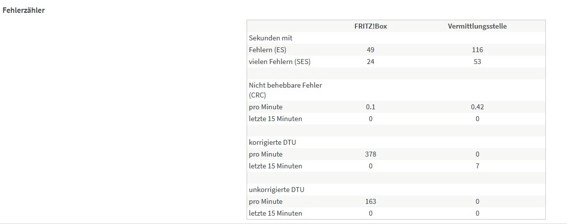 Bei einer fehlerfreien TAL (https://de.wikipedia.org/wiki/Teilnehmeranschlussleitung) müssen die in der Fritzox ersichtlichen CRC-Fehler niedrig sein, idealerweise gleich null. Die korrigierten DTU-Fehler müssen auch niedrig sein. Sobald es aber unkorrigierte DTU-Fehler gibt und dann auch noch die Leitung zusammenbricht, stimmt etwas nicht.