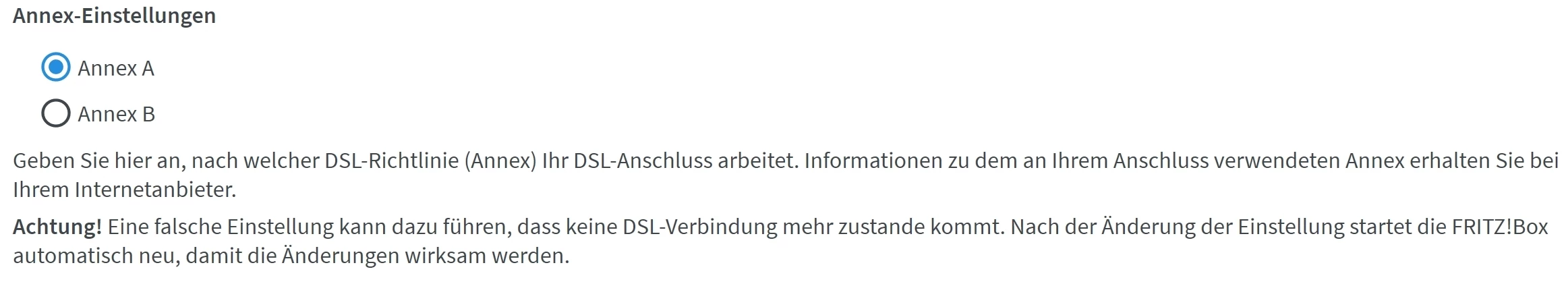 Bei Installation des Fritz Os ist Annex B vorgegeben und hat auch bei meinem Anschluss funktioniert. Aufgrund deines Beitrages habe ich in meiner Fritzbox einmal auf Annex A umgestellt. Es gibt keine Veränderung, alles läuft so, wie bei der Einstellung Annex B.
