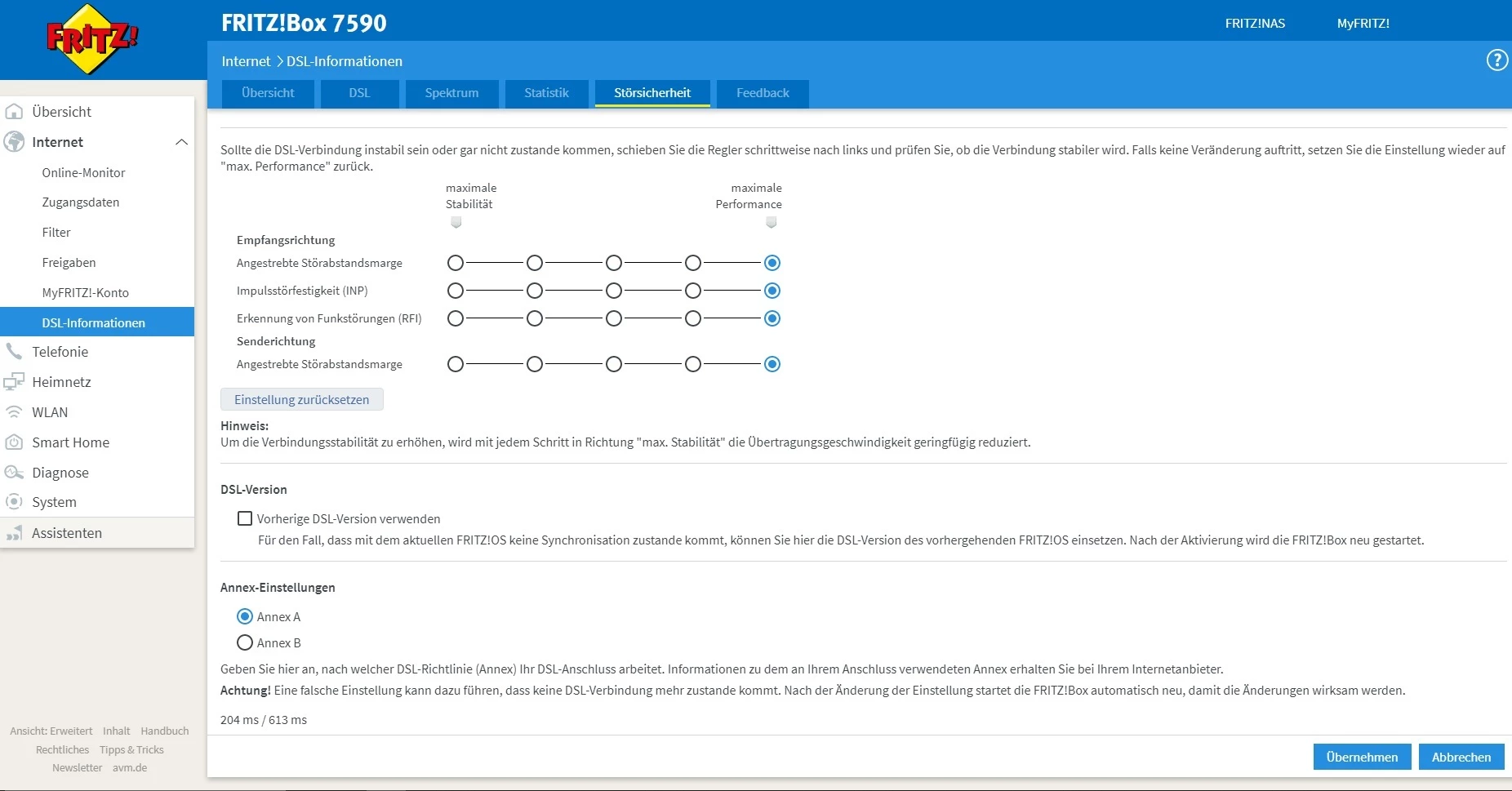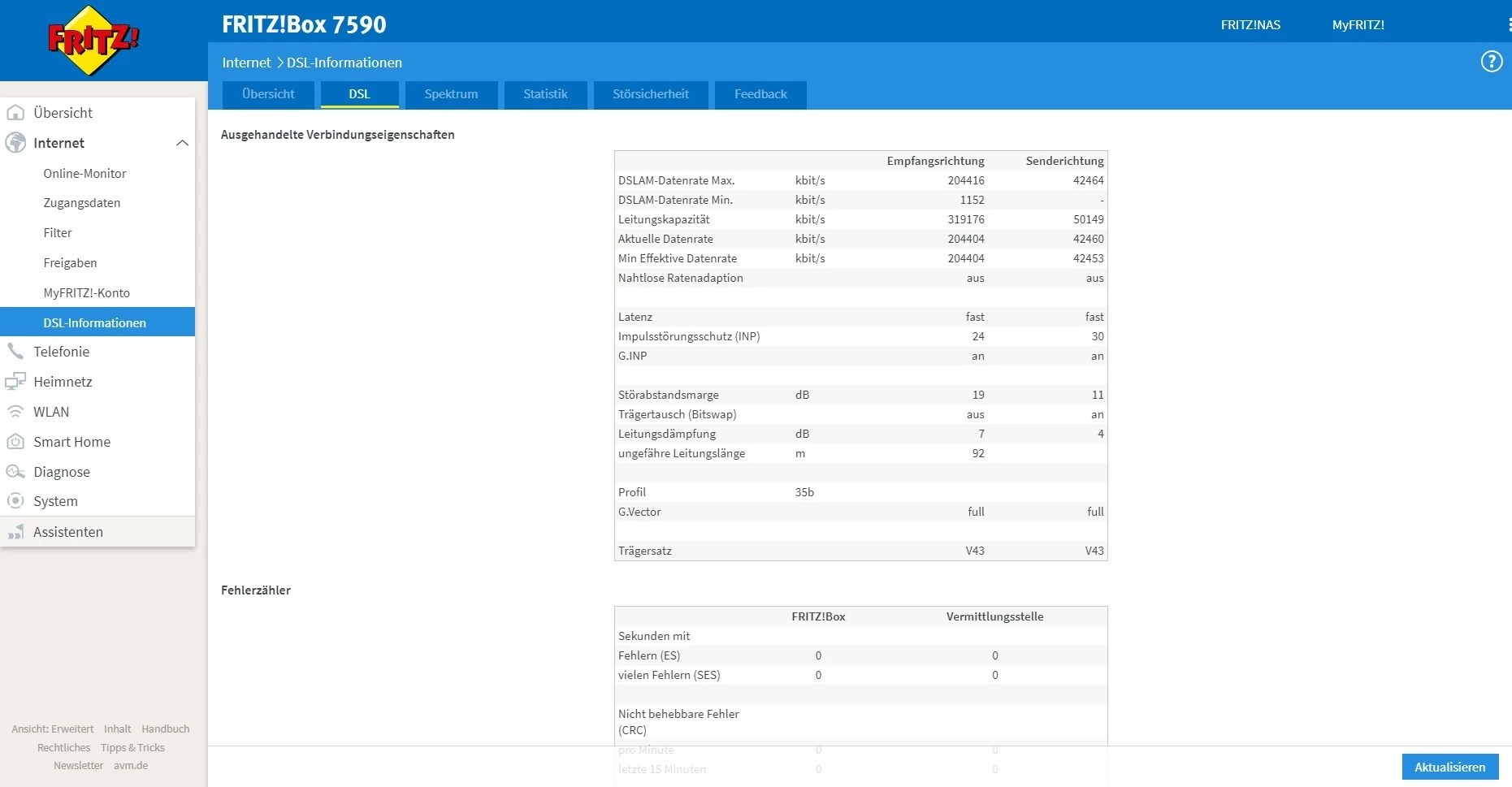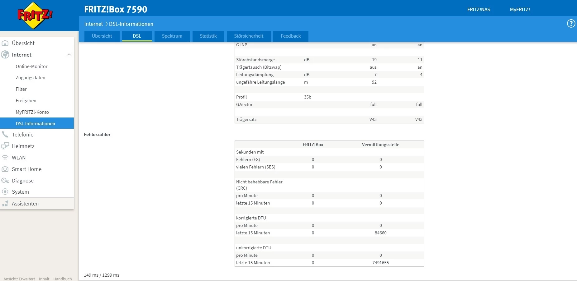 Zudem setze bitte an der Fritzbox mal alle Einstellungen auf “max. Performance” und mache dann einen Screenshot der Tabelle unter “DSL” mit allen Leitungsparametern incl. der CRC-Fehler ganz unten.