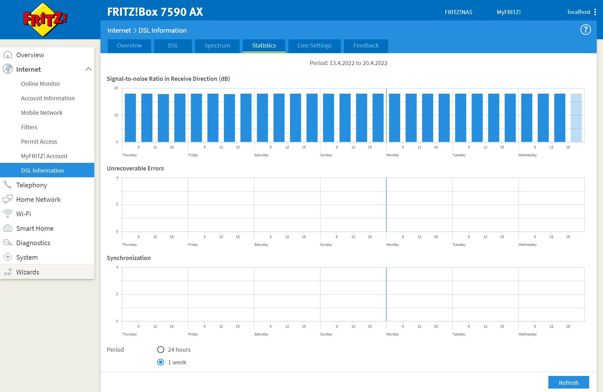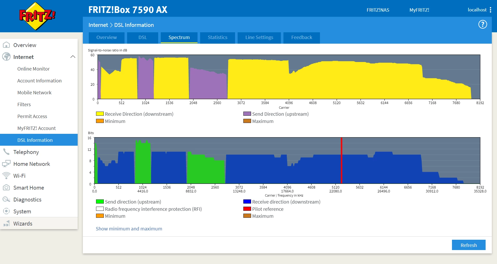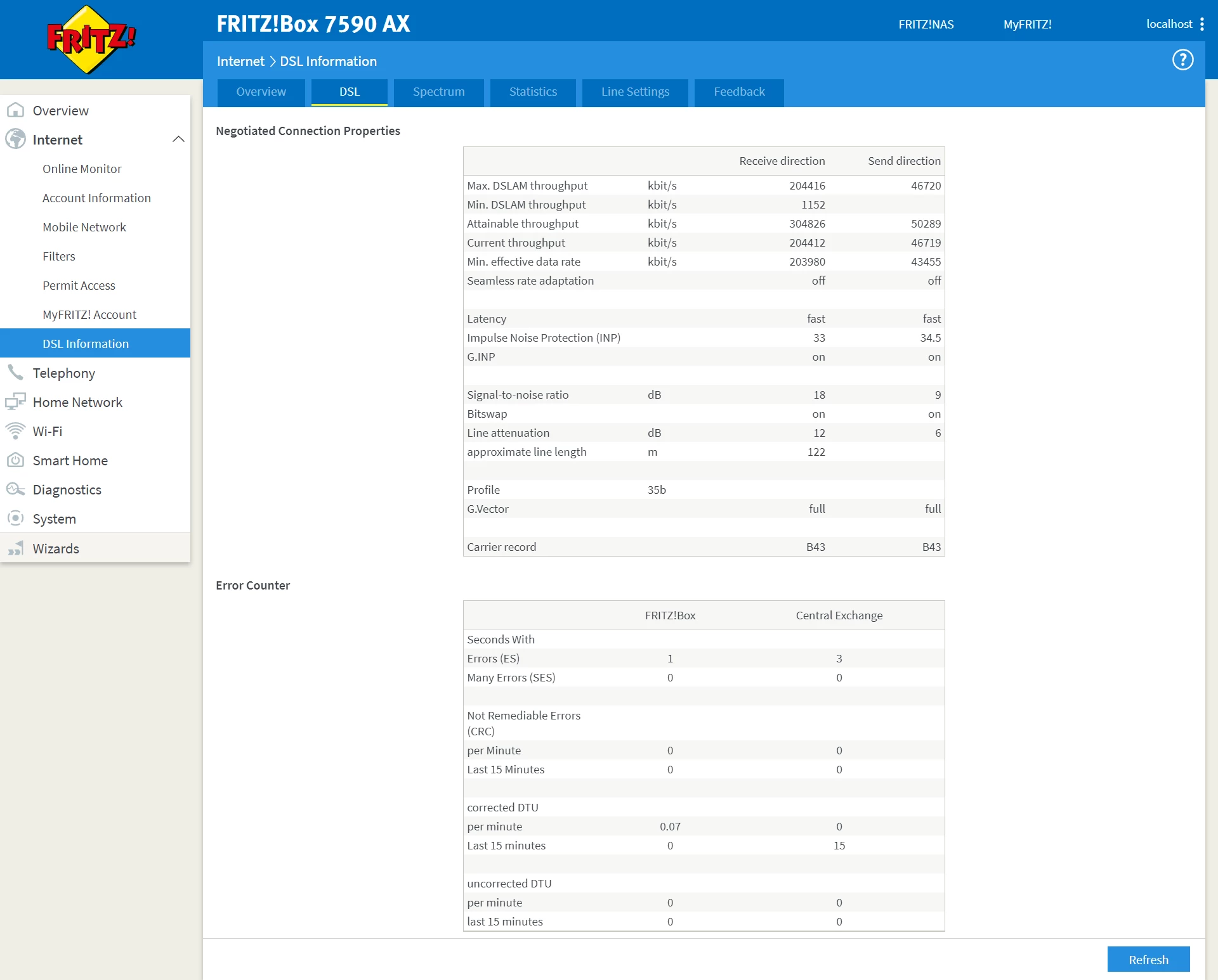 magst du in deiner Fritzbox mal unter Internet → DSL Informationen → DSL (inkl. die Tabelle mit den Fehlern), Spektrum, Statistik ( bitte auf Woche stellen)  schauen? Und bitte als Screenshot beifügen?
