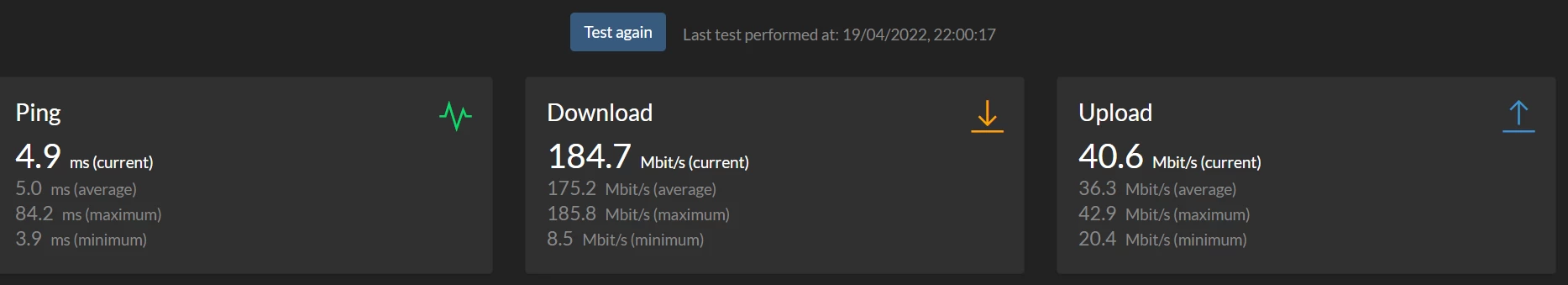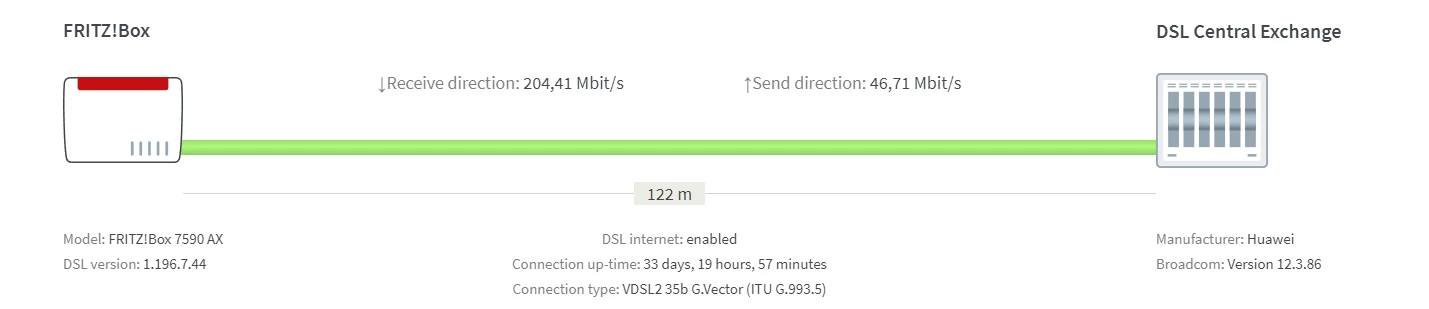 Seit ich den Vertrag abgeschlossen habe, beträgt die Verbindungsgeschwindigkeit durchschnittlich 185 MBit/s mit einer Verbindungsgeschwindigkeit von 204MBit/s (siehe Bilder unten), obwohl ich für 250MBit/s bezahle. Ich habe für den gesamten Zeitraum entsprechende Logs.