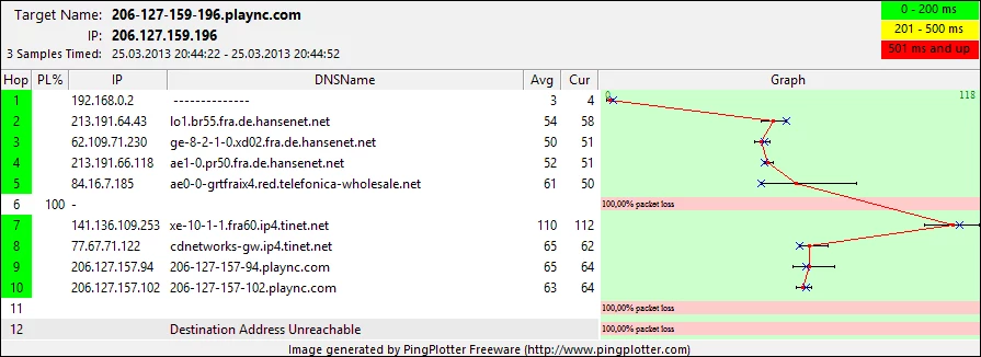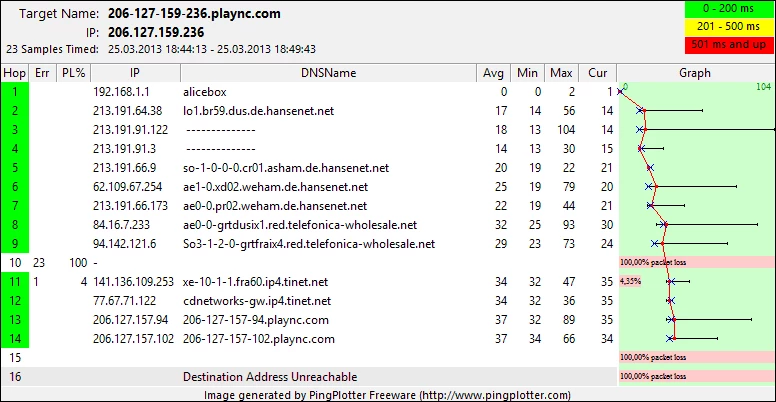 Ablaufverfolgung beendet.Berechnung der Statistiken dauert ca. 125 Sekunden...            Quelle zum Abs.  Knoten/VerbindungAbs. Zeit   Verl./Ges.=   %  Verl./Ges.=   %  Adresse  0                                           Kreissl91-PC [192.168.0.3]                                0/  25 =  0%   |  1    3ms     0/  25 =  0%     0/  25 =  0%  192.168.0.2                                0/  25 =  0%   |  2   62ms     7/  25 = 28%     7/  25 = 28%  lo1.br55.fra.de.hansenet.net [213.191.64.43]                                0/  25 =  0%   |  3   58ms     0/  25 =  0%     0/  25 =  0%  ge-8-2-1-0.xd01.fra.de.hansenet.net [62.109.70.230]                                1/  25 =  4%   |  4   63ms     6/  25 = 24%     5/  25 = 20%  ae0-0.pr50.fra.de.hansenet.net [213.191.66.110]                                0/  25 =  0%   |  5   57ms     1/  25 =  4%     0/  25 =  0%  ae0-0-grtfraix4.red.telefonica-wholesale.net [84.16.7.185]                                5/  25 = 20%   |  6  154ms     6/  25 = 24%     0/  25 =  0%  Xe5-0-0-0-grtnycpt3.red.telefonica-wholesale.net [94.142.117.197]                                0/  25 =  0%   |  7  217ms    17/  25 = 68%    11/  25 = 44%  Xe9-3-0-0-grtpaopx2.red.telefonica-wholesale.net [94.142.118.186]                                0/  25 =  0%   |  8  228ms     7/  25 = 28%     1/  25 =  4%  te-4-2.car1.SanJose2.Level3.net [4.59.0.225]                                0/  25 =  0%   |  9  218ms    19/  25 = 76%    13/  25 = 52%  vlan60.csw1.SanJose1.Level3.net [4.69.152.62]                                0/  25 =  0%   | 10  219ms     6/  25 = 24%     0/  25 =  0%  ae-61-61.ebr1.SanJose1.Level3.net [4.69.153.1]                                0/  25 =  0%   | 11  218ms    19/  25 = 76%    13/  25 = 52%  ae-5-5.ebr1.SanJose5.Level3.net [4.69.148.137]                                0/  25 =  0%   | 12  231ms     6/  25 = 24%     0/  25 =  0%  ae-1-100.ebr2.SanJose5.Level3.net [4.69.148.110]                                0/  25 =  0%   | 13  243ms    19/  25 = 76%    13/  25 = 52%  ae-6-6.ebr2.LosAngeles1.Level3.net [4.69.148.201]                                0/  25 =  0%   | 14  180ms     6/  25 = 24%     0/  25 =  0%  ae-3-3.ebr3.Dallas1.Level3.net [4.69.132.78]                                0/  25 =  0%   | 15  180ms     8/  25 = 32%     2/  25 =  8%  ae-93-93.csw4.Dallas1.Level3.net [4.69.151.169]                                0/  25 =  0%   | 16  185ms     7/  25 = 28%     1/  25 =  4%  ae-4-90.edge2.Dallas1.Level3.net [4.69.145.203]                                0/  25 =  0%   | 17  178ms     8/  25 = 32%     2/  25 =  8%  4.59.197.34                                0/  25 =  0%   | 18  223ms     6/  25 = 24%     0/  25 =  0%  64.25.32.9                                0/  25 =  0%   | 19  ---      25/  25 =100%    19/  25 = 76%  64.25.32.26                                0/  25 =  0%   | 20  229ms     6/  25 = 24%     0/  25 =  0%  64.25.39.1Ablaufverfolgung beendet.
