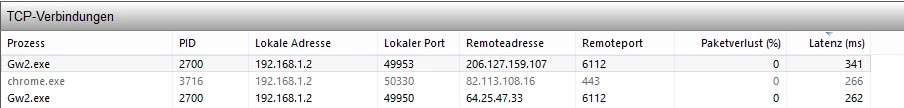 "Taskmanager —> Leistung —> Ressourcenmonitor —> Netzwerk und dann bei den TCP Verbindungen mal nach Abbild sortieren. Da tauchen dann 3 oder 4 Verbindungen für die GW2.exe auf."