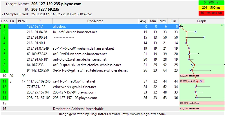 Zwischem Deinem Router und dem ersten Hop von Hansenet hast Du auch Pakete verloren. Bei manchen Routern von Alice kommt man an die Daten zur Fehlerrate der DSL-Verbindung dran. Kannst Du den Routertyp benennen?