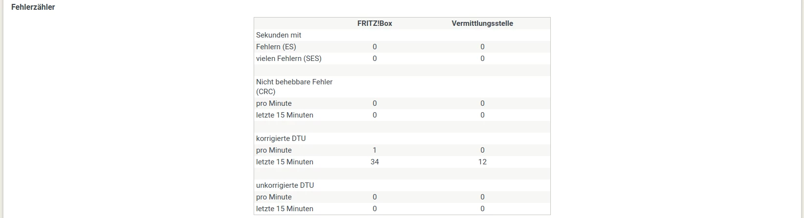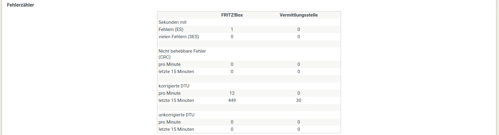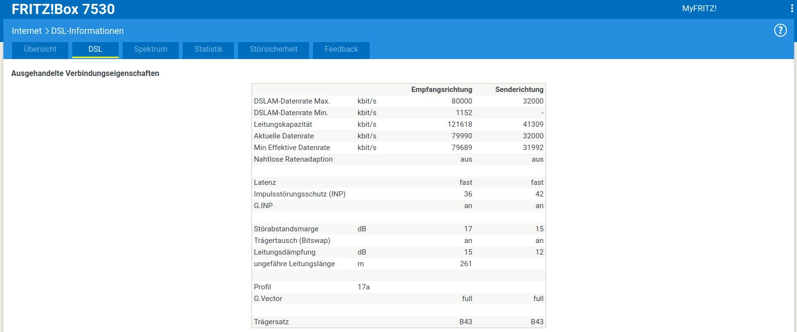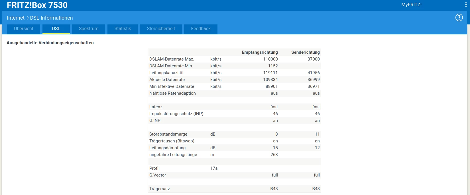 Zunächst hielt ich die FRITZ!Box 7390, die ich noch aus der Vergagenheit besaß und die die bekannten Probleme der Vectoring-Synchronisation zeigte für verantwortlich, aber während der Wechsel auf eine FRITZ!Box 7530 einen Anstieg der angegebenen Leistungskapazität und aktuellen Datenrate brachte, blieben die Messergebnisse unverändert, auch obwohl alle Regler der Störsicherheit nach wie vor auf maximaler Performance stehen.