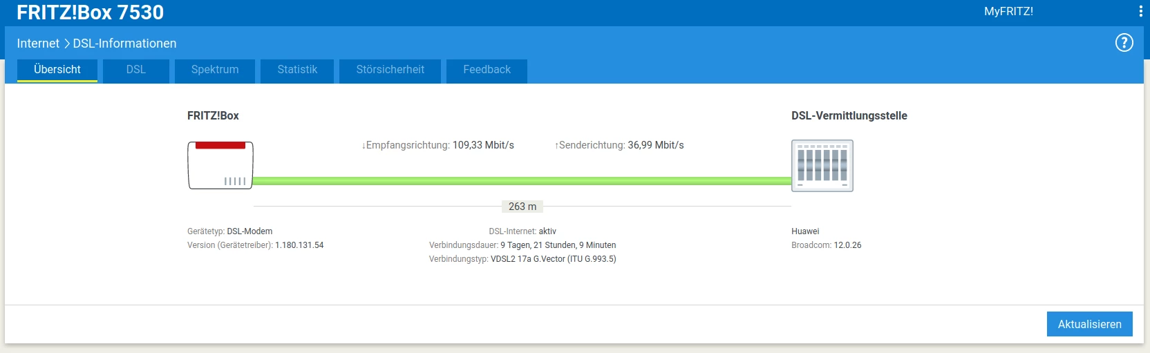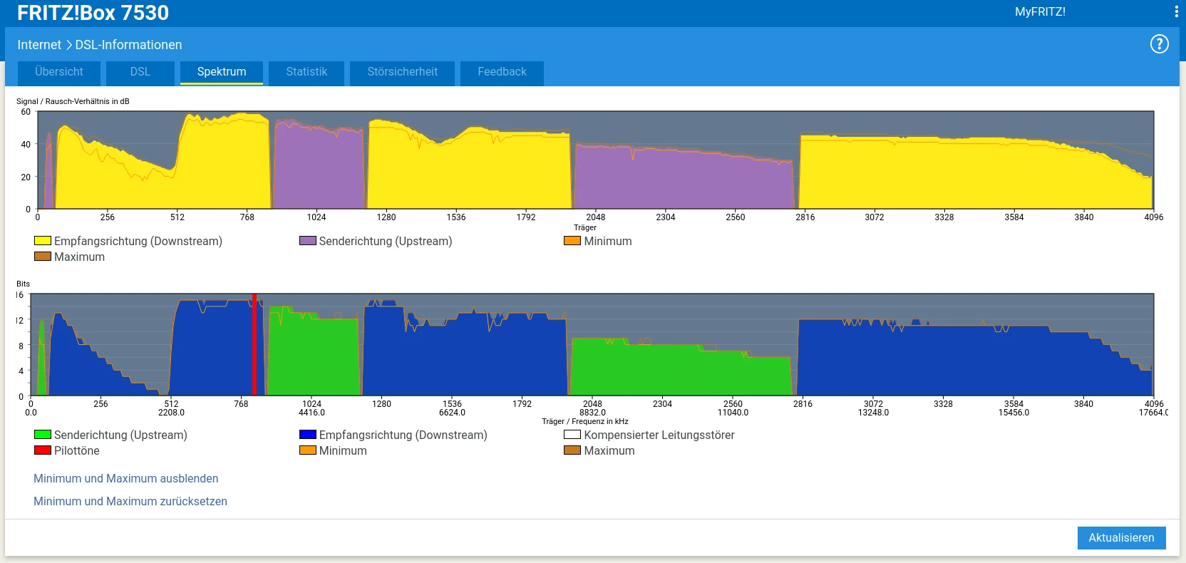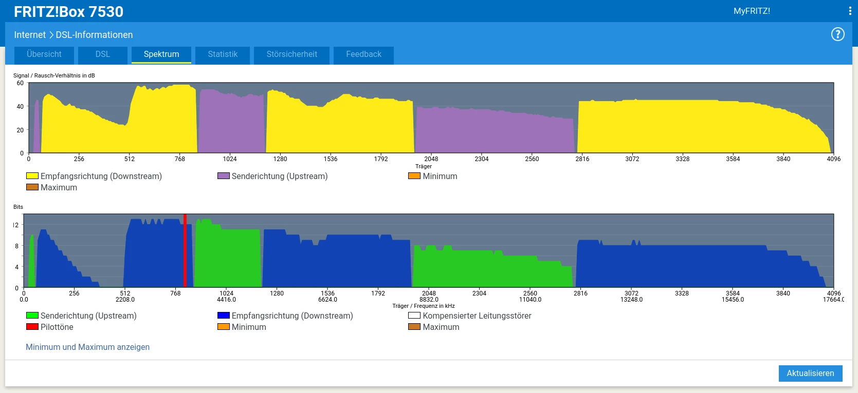 Zunächst hielt ich die FRITZ!Box 7390, die ich noch aus der Vergagenheit besaß und die die bekannten Probleme der Vectoring-Synchronisation zeigte für verantwortlich, aber während der Wechsel auf eine FRITZ!Box 7530 einen Anstieg der angegebenen Leistungskapazität und aktuellen Datenrate brachte, blieben die Messergebnisse unverändert, auch obwohl alle Regler der Störsicherheit nach wie vor auf maximaler Performance stehen.