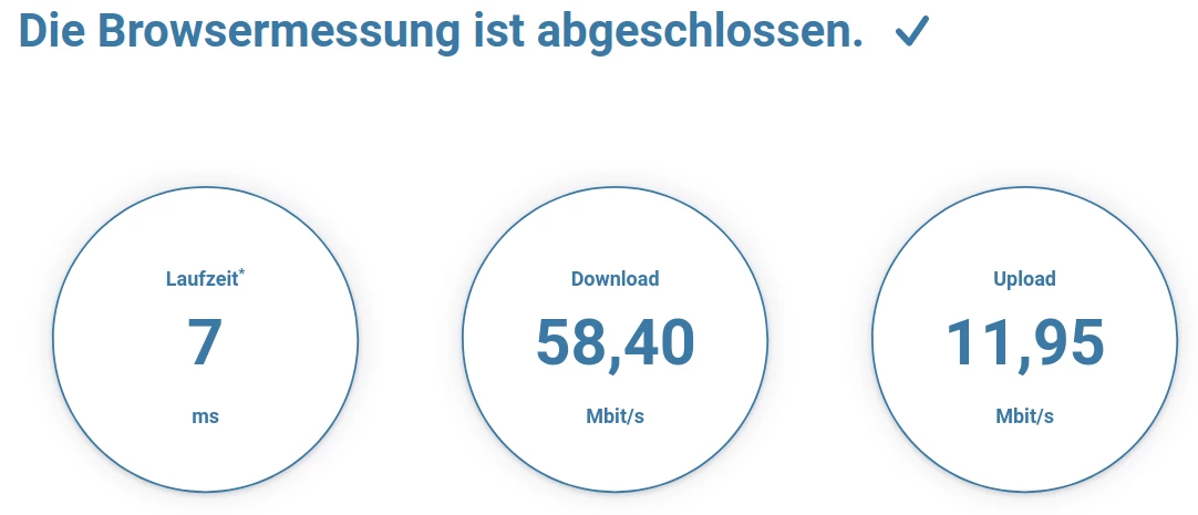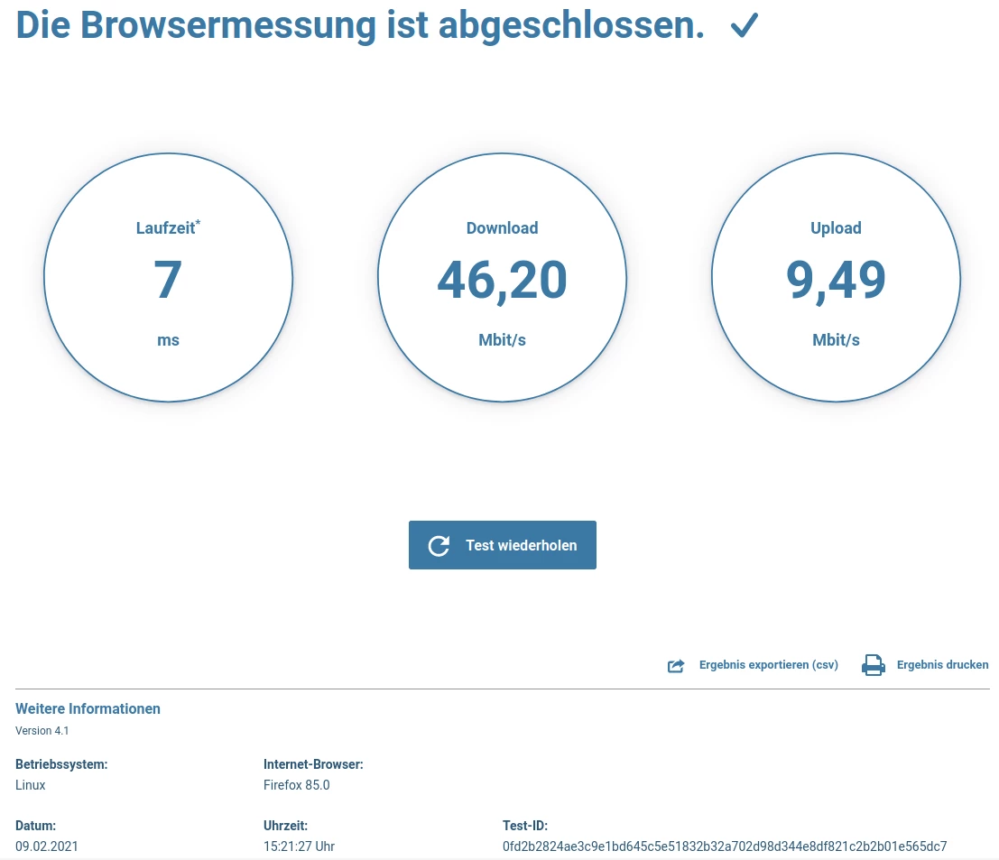 Getestet habe ich wie gesagt an unterschiedlichen Tagen und zu unterschiedlichen Uhrzeiten u. a. bei wieistmeineip.de und speedtest.net, wobei ich bei Zweitem bestimmt 10 verschiedene Gegenstellen durchprobiert habe, ohne konsistente Veränderungen.