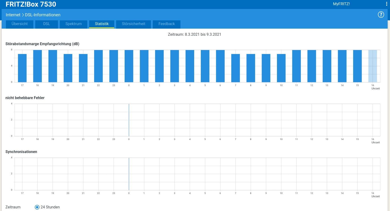 Aus Interesse daran, ob es zu einer Veränderung führen würde, habe ich an diesem Tag dennoch die Störsicherheits-Einstellungen der 7530 kurzzeitig Richtung Stabilität verschoben, ohne aber eine Verbesserung wahrnehmen zu können. Sowohl dabei, als auch kurz darauf, als ich wieder auf volle Leistungsfähigkeit zurückgestellt habe, kam es zu einer Neusynchronisation, die sich für mich zunächst nur in Form veränderter Empfangs- und Sendungsrichtungsdatenraten von nunmehr 109,33 respektive 36,99 MBit/s statt glatten 110 und 37 MBit/s äußerte.