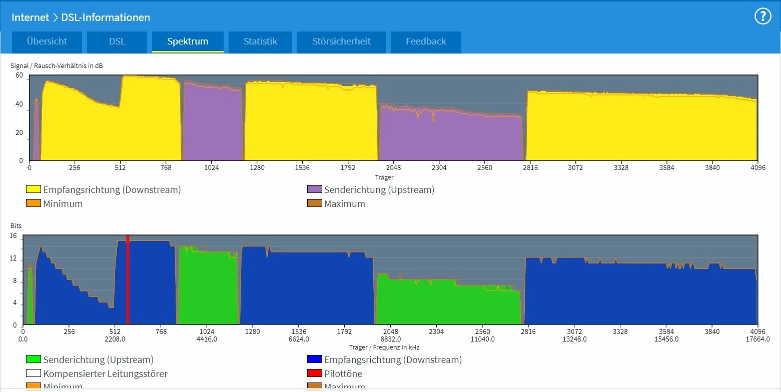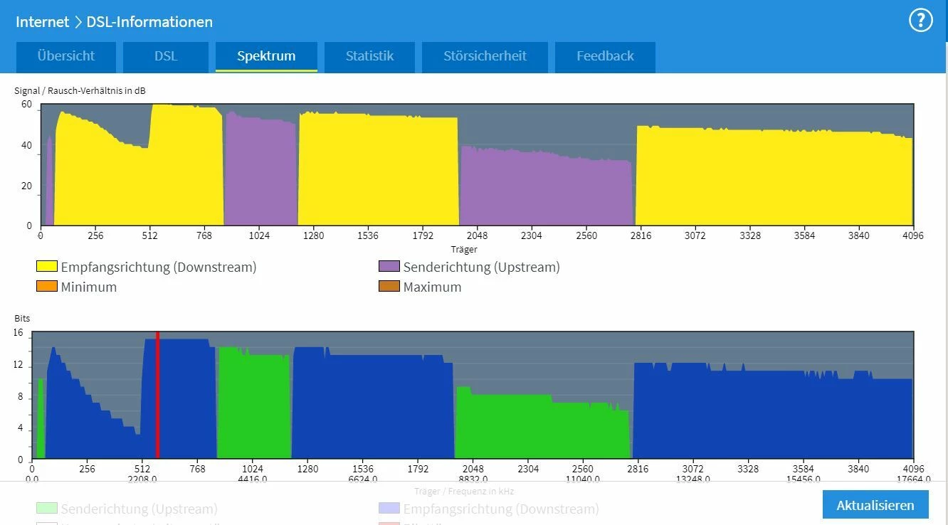 Mach beim Spektrum Min /Max aktiv,und hänge die DSL-Infos inkl Fehlerzähler und Statistik noch an.