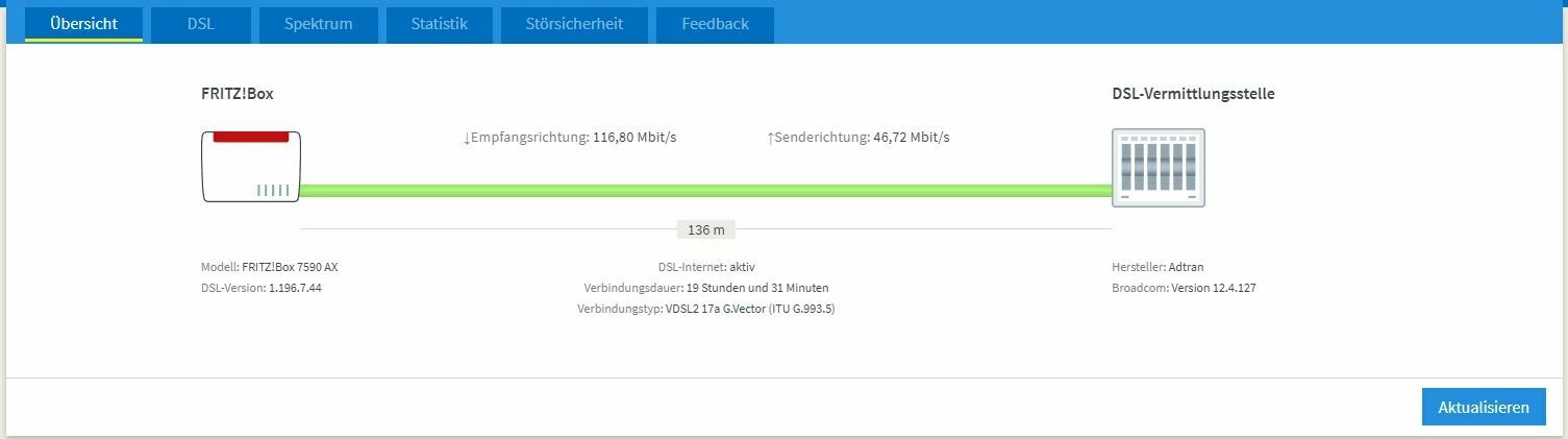 Und ja, das DSL-Anschlusskabel ist das Originale von der neuen Fritzbox, ohne Verlängerung oder sonstiges.