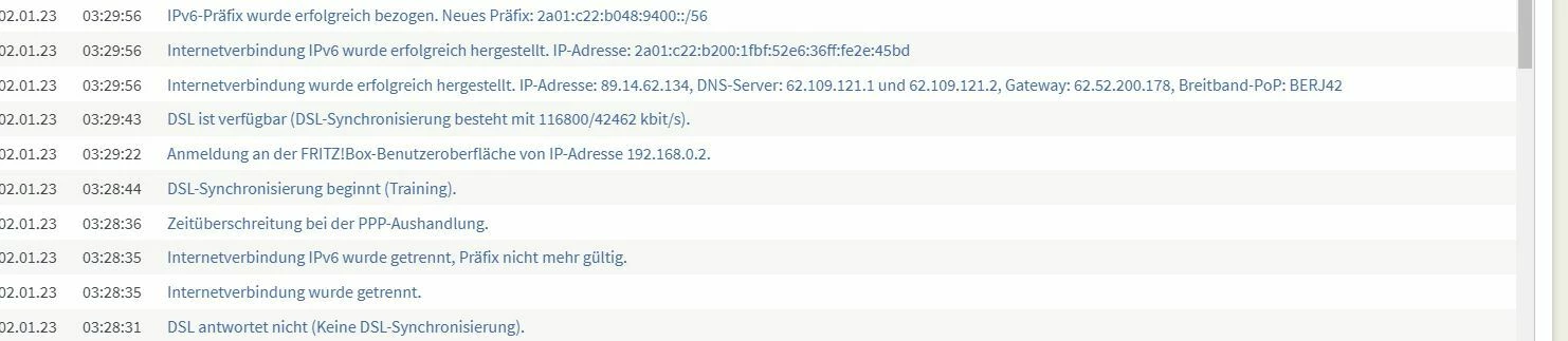 Da du die neue FB am 23.12.2022 in Betrieb genommen hast, hat ASSIA eine Woche später deine Leitung im nächtlichen Wartungsfenster zwischen 3 Uhr und 4 Uhr sukzessive wieder erhöht. Dazu ist eine einmalige Neusynchronisation, ggf. auch zwei hintereinander, erforderlich. Du hast mittlerweile Fullspeed und keinerlei Fehler. Es kann sein, dass das die Tage nochmals passiert zwischen 3 und 4 Uhr, danach ist Ruhe.
