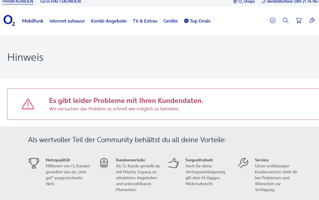 Hi. meine DSL Vertags ist überfällig. Klick ich auf Vertragsverlängerung erscheint immer die FM: Es gibt ein Problem mit ihren Kundendaten … wir arbeiten daran….