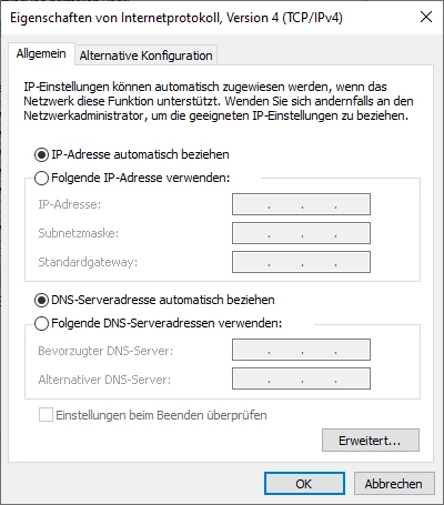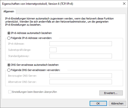 Meine Konfigurationen des Ethernet Adapters habe ich für IPv4 und IPv6 auf automatisch stehen.