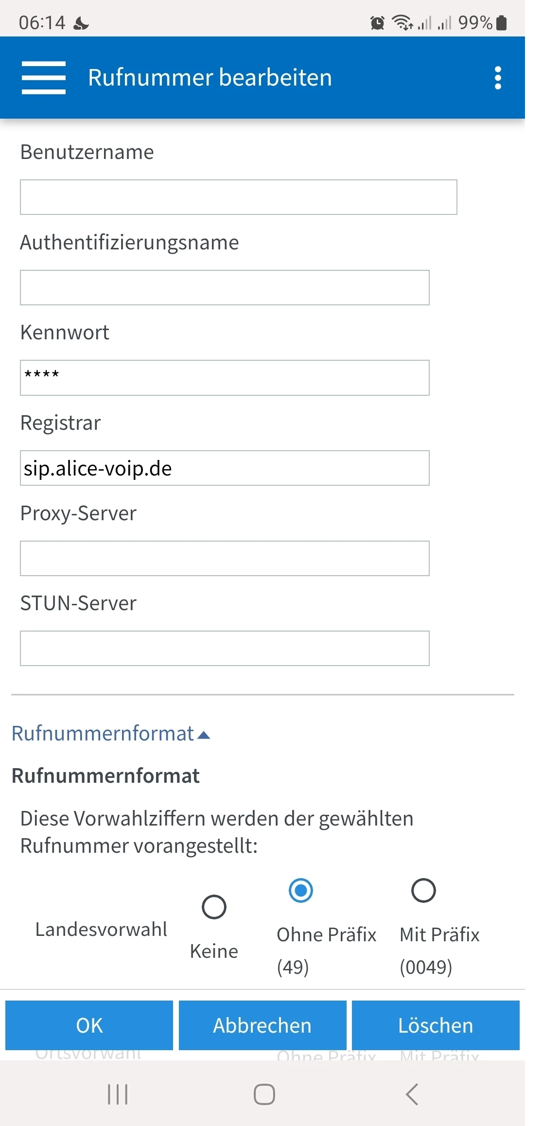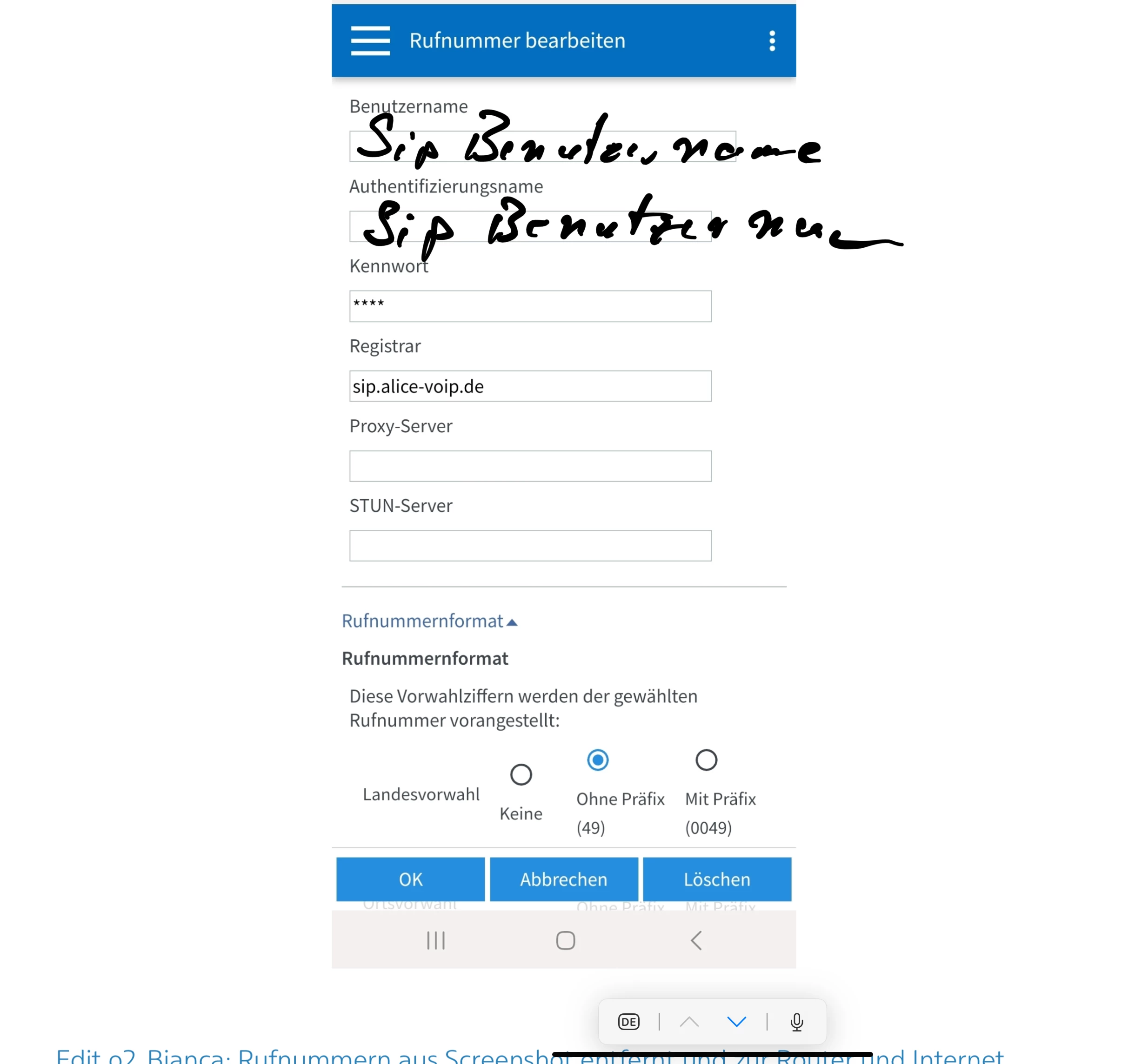 Soweit nach den vielen Hilfen im Netz eingetragen. Jedoch erhalte ich den Fehler : Rufnummer nicht registriert bzw Fehler 403.