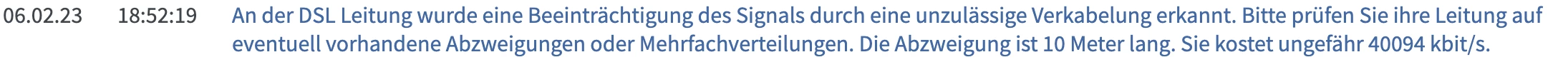 Wir nutzen normalerweise die TAE Dose im Wohnzimmer, ich habe aber auch mal die Dose direkt neben der Eingangstür probiert und dort viel weniger Leistung bekommen nur max 60k down (bei der anderen Dose 200k down). Bei der Dose direkt neben der Tür gab es dann auch die Meldung, dass eine unzuverlässige Verkabelung vorliegt.