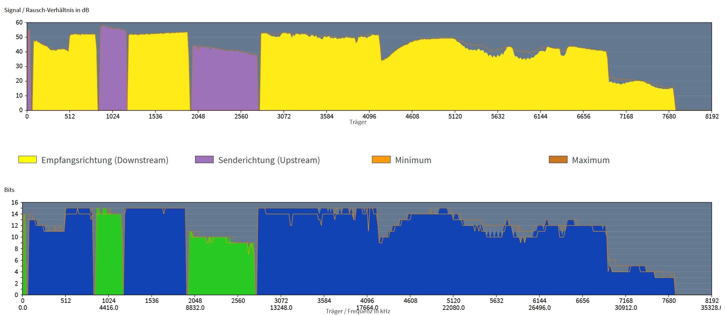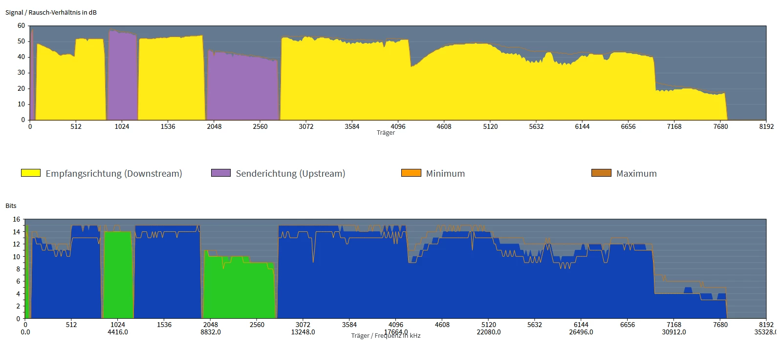 Man achte auf die “Delle” da beim SNR oben. Und mit 5 im Download und den korrigierten DTU … hui