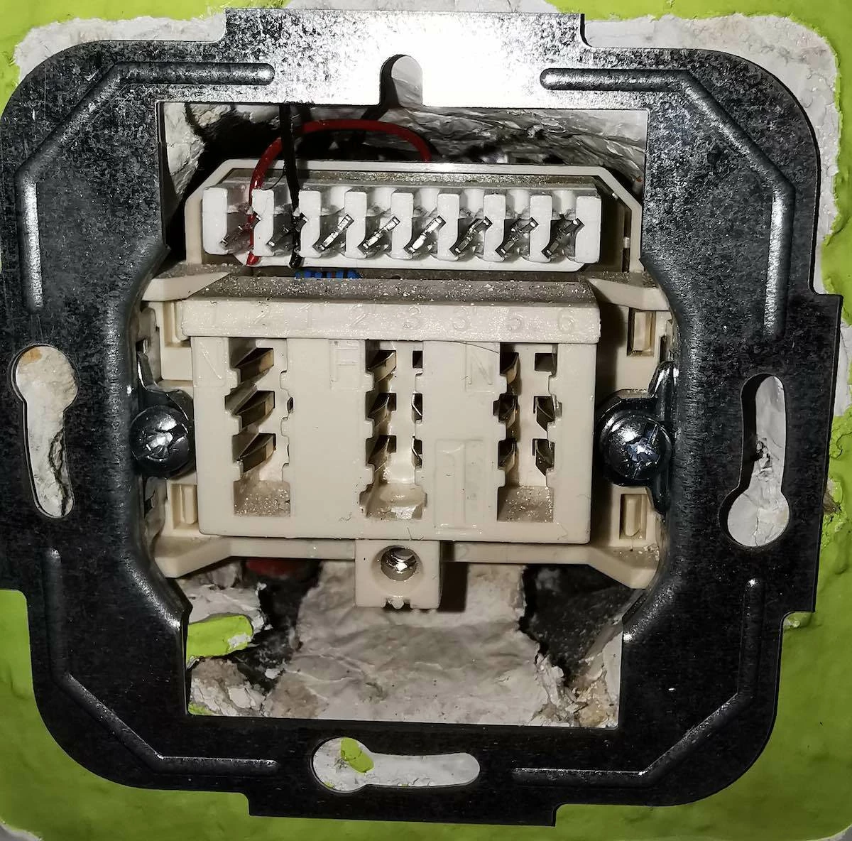 Bei der Gelegenheit habe ich nun auch mal die Blende von der Dose abgeschraubt. Anbei ein Bild der Verkabelung. Es sind eigentlich nur 2 Kabel angeschloßen.