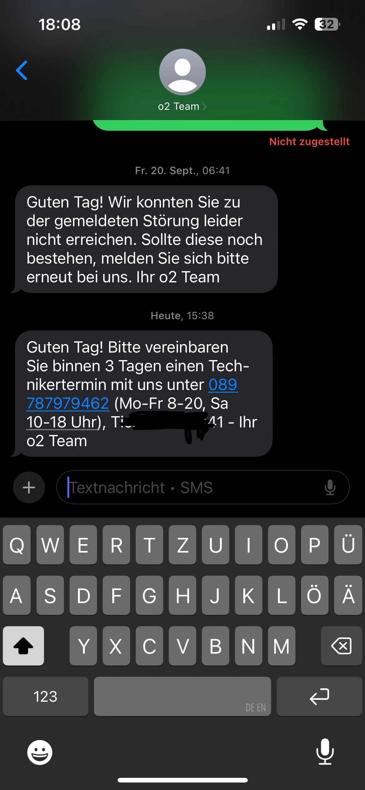 Ich erhalte eine Nachricht von O2, ich solle mich bitte beim Techniker melden, um einen Termin zu vereinbaren. Habe ich auch gemacht.