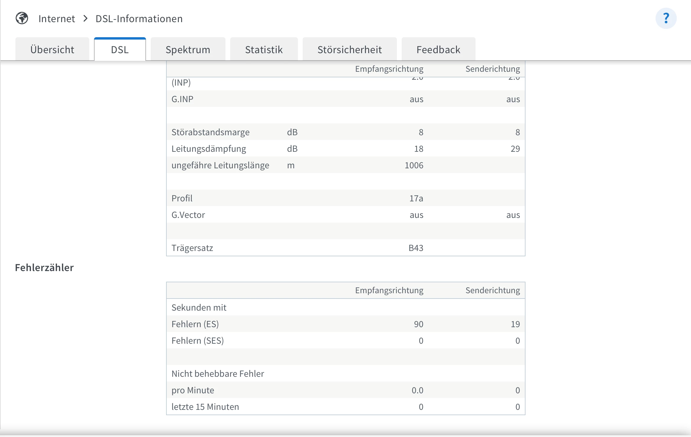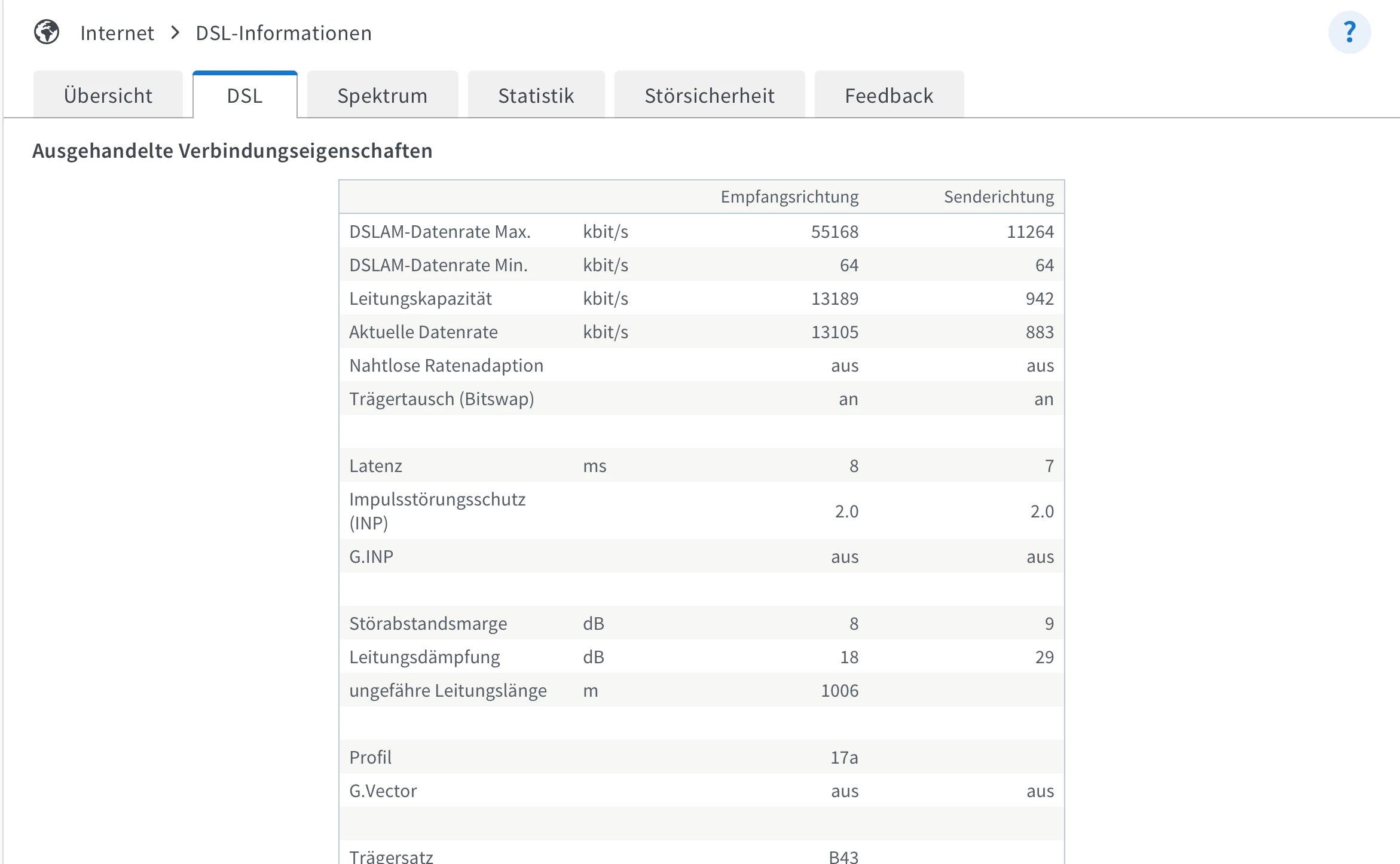 @Stefan1121  Den Screenshots deiner Fritzbox aus dem Vorgänger-Thread nach zu urteilen, hast du eine Leitungslänge von 1000 Metern, und läuft die Fritzbox mit dem sog. Fallback-Profil auf ADSL2PLUS-Basis.